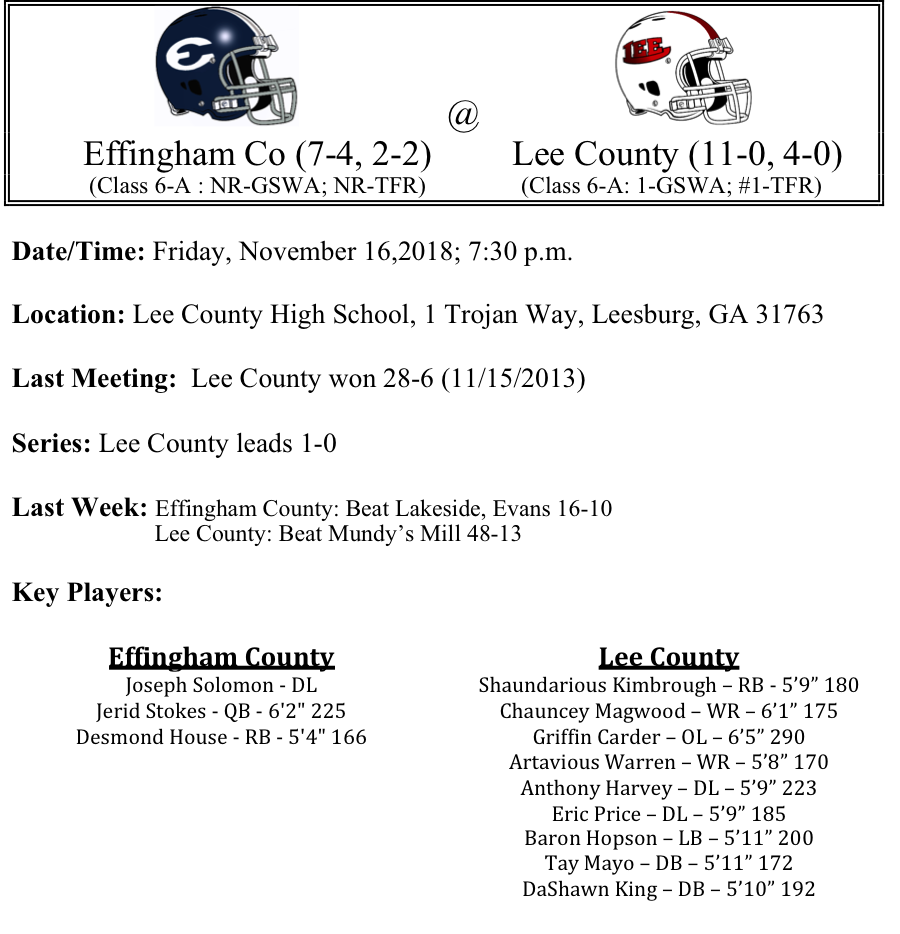 The Effingham County Rebels are next up for the Lee County Trojans. The Rebels got by Lakeside Evans by 6 points last week. Desmond House and Ashaud Roberson have combined for over 1,200 yards rushing through 10 games. Effingham County is averaging 26.1 points per game while the defense is allowing 17.9 points per game. The Rebels will be facing a Lee County team that is averaging 47.2 points per game and giving up 5 points per game. The 13 points allowed against Mundy’s Mill was the most that the team has given up in one game the entire season. We can’t think of many scenarios where the Rebels will have much success beating Lee County this week. We’ll take Lee County by four touchdowns.