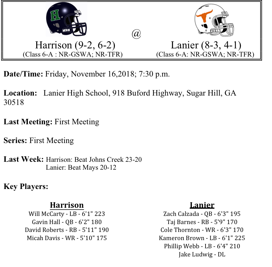 The Harrison Hoyas were the third No. 4 seed to beat a No. 1 seed last week in Class 6-A. The Hoyas will travel to Sugar Hill to take on the Lanier Longhorns. We mentioned last week that the Hoyas are not the run of the mill No. 4 seed. Harrison was within one-point of a region title the last game of the regular season. The Hoyas are led by quarterback Gavin Hall and junior running back David Roberts. Harrison is averaging 38.2 points per game, while their defense is giving up 18.4 points per game. The host Lanier Longhorns will be looking to get past the 2ndround for the first time in school history. The Longhorns are averaging 23.3 points per game, while their defense is giving up 14.9 points per game. Zach Calzada has passed for 1,431 yards and 13-TDs while Taj Barnes continue to lead the rushing attack with 856 yards and 4-TDs. We think that Lanier will be challenged against a physical Harrison defense. But we also believe the Hoyas win this game by a touchdown.