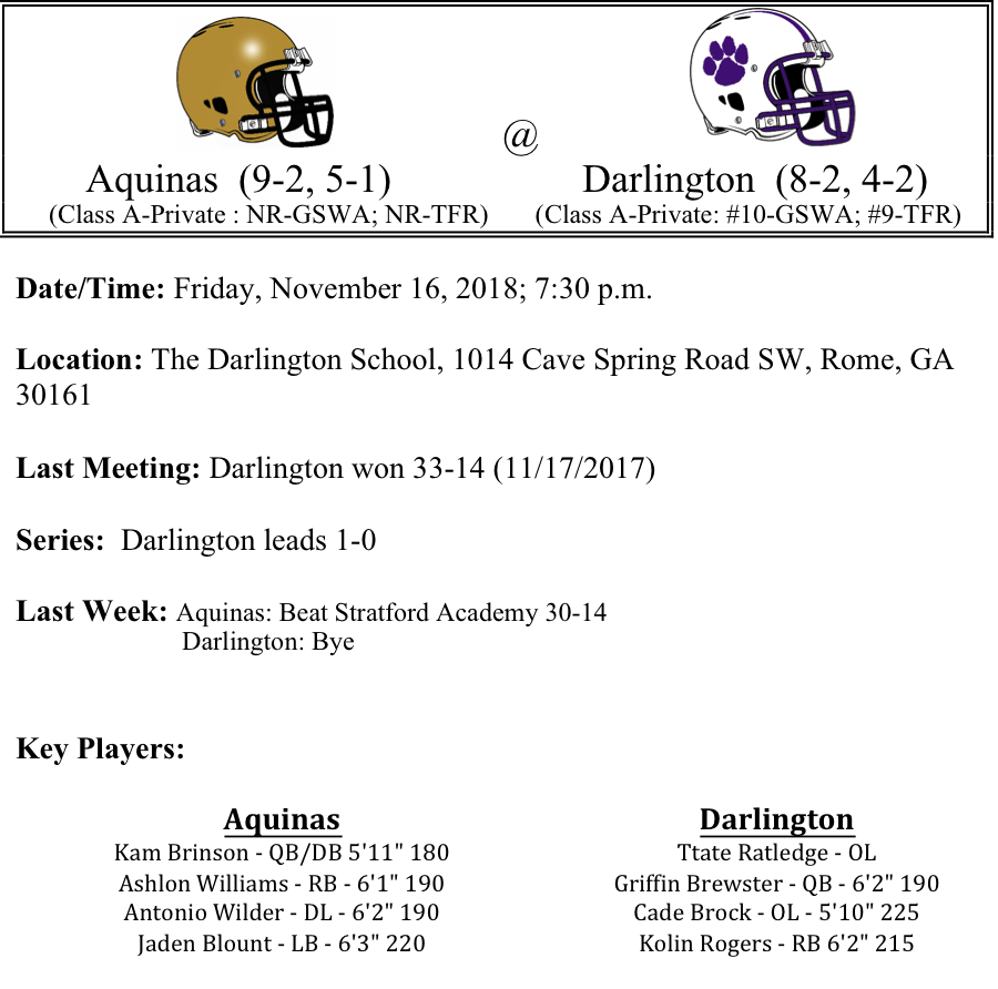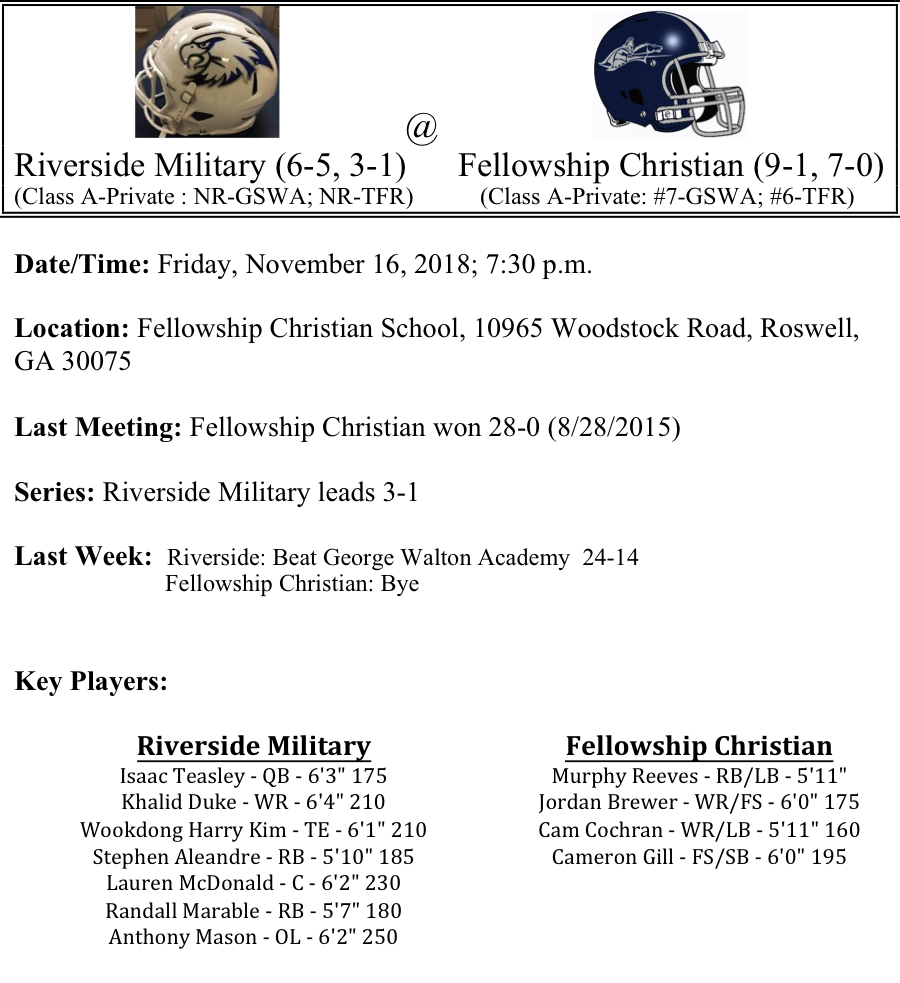 Our last set of week two GHSA-A-Private Playoff previews are listed below. This preview features matchups between Riverside Military-Fellowship Christian, Hebron Christian-Savannah Christian, Aquinas-Darlington, and Trinity Christian-ELCA. Congratulations to all of these teams that won their first round game. Best of luck to you all as you play this Friday.