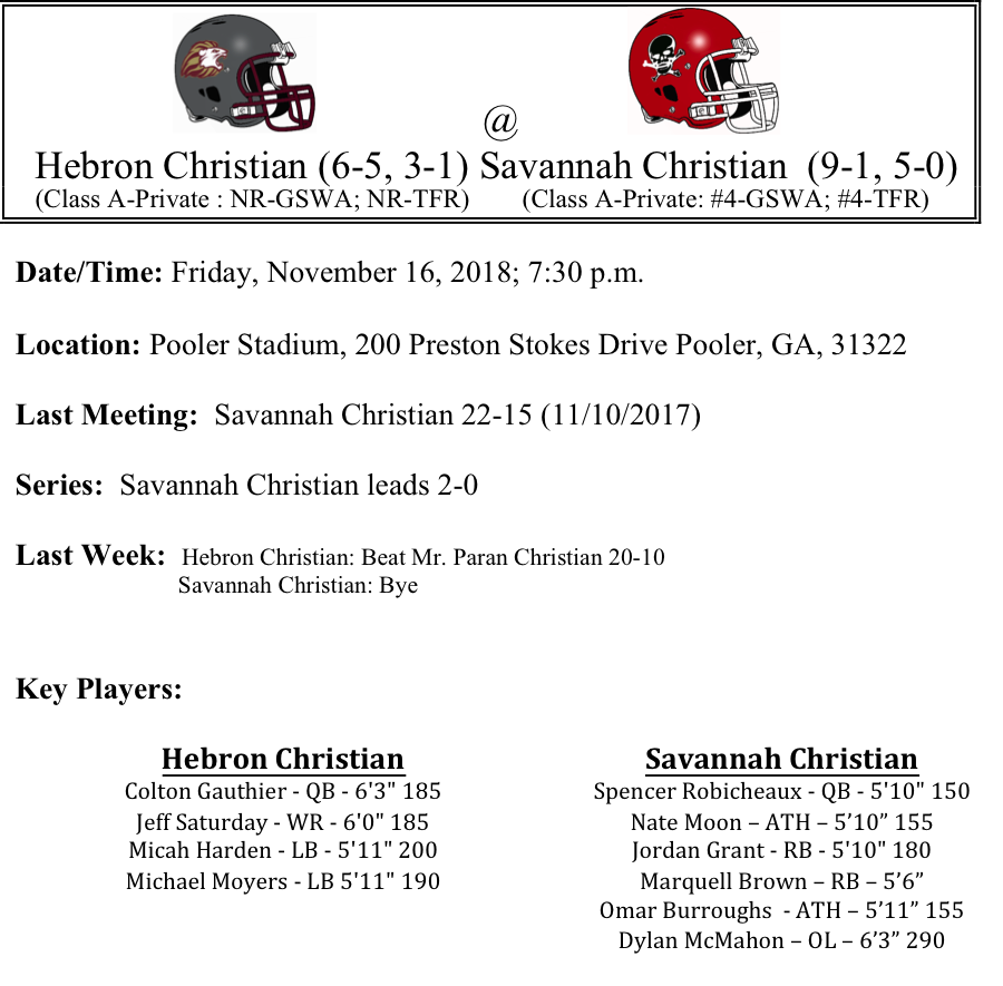 Head Coach Jeff Saturday has the Hebron Christian Lions moving in the right direction. The Lions are in the 2nd round of the playoffs for the first time in school history. As we mentioned last week Hebron Christian is led by Colton Gauthier who has passed for 1,915 yards and 19-TDs on the season. Jeffrey Saturday is his primary receiver. Saturday caught 4 passes for 71-yards and one touchdown last week. On the season, he has caught 49 passes for 900 yards and 11-TDS. Host Savannah Christian claimed a region title under the direction of first year head coach Baker Woodward. Woodward was the former O/C at Benedictine. He has brought his system to Savannah Christian and has gotten his players to buy in. The only blemish on their record is a week one loss to Athens Academy. Dylan McMahon anchors both the offensive and defensive lines. Spencer Robicheaux leads the team in passing while Nate Moon (810 yards, 11-TDs) leads the rushing attack. Savannah Christian is scoring 37.2 points per game. We know that Hebron certainly will not go quietly into the night. We think they are about a year away from making a deep run. We like the Savannah Christian Raiders to survive and advance by a touchdown.