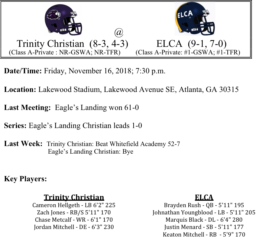 Trinity Christian is no stranger to post season action, but much of their success had previously been at the GISA level. The Lions won their first GHSA playoff game last week and as a prize, they will visit Eagle’s Landing Christian Academy. This won’t be a traditional home game for Eagle’s Landing, as the game has been moved to Lakewood Stadium in Atlanta due to the recent rains that made field conditions unplayable on Friday. Trinity Christian is led by Zach Jones who has rushed for 1,005 yards and 10-TDs. The Lions are averaging 25.4 points per game on offense, while the defense is giving up 15.5 points per game. Since ELCA’s 37-game win streak has been stopped, the Chargers have been on a role. Their smallest margin of victory since that time was 21 points. On the season, they are averaging 53.3 points per game, while the defense is only allowing 6.2 points each time out. Senior Quarterback Brayden Rush has been at the helm for all 3 of the prior championship runs. I guess we should also mention that ELCA beat Trinity Christian earlier this season by 61 points. We just don’t think Trinity has closed the gap that much. We like ELCA to win by six touchdowns.