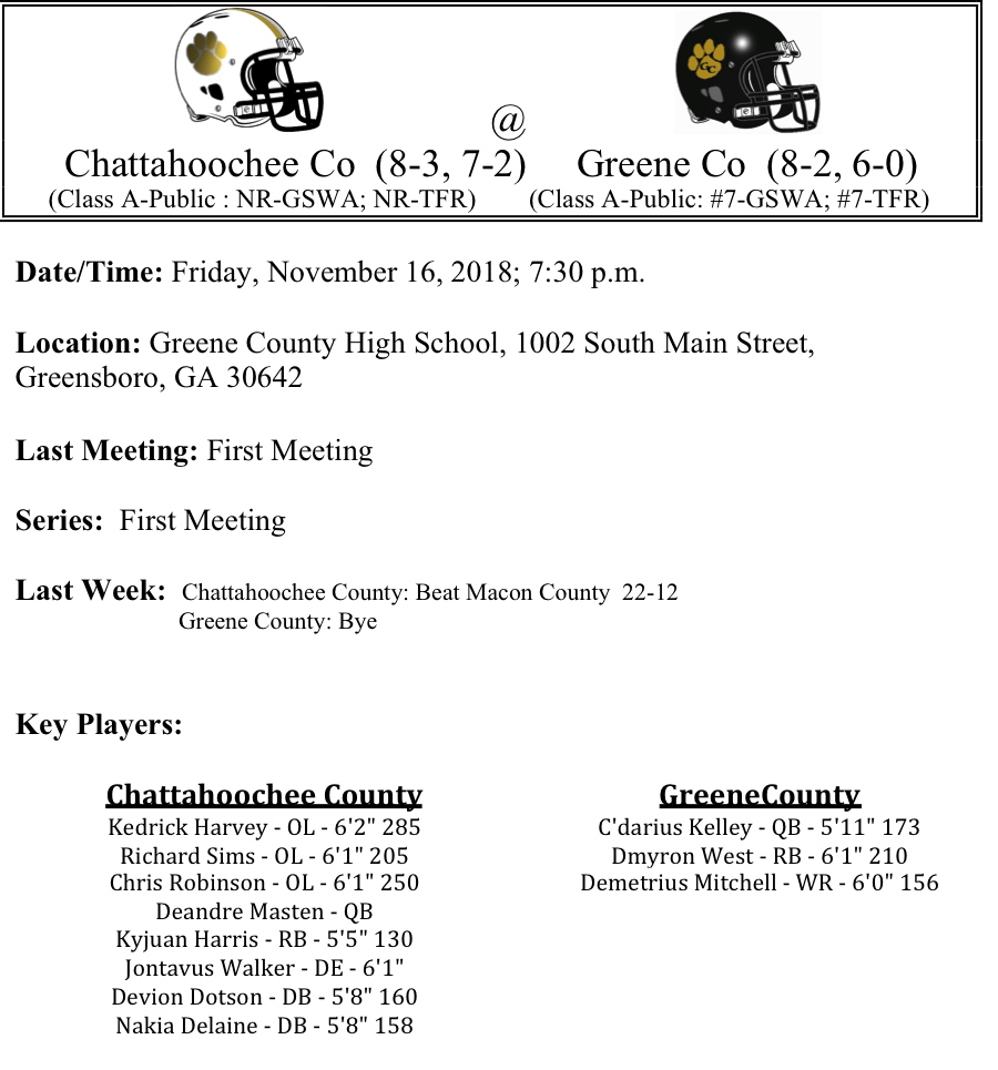 The Greene County Tigers are in the playoffs for the 4thtime in 5 years. The Tigers have gotten steady production from quarterback C’darius Kelley this season as he has passed for 1,449 yards and rushed for 930, combining for 28 total TDs. Greene County is averaging 30.4 points per game and has scored wins over two playoff teams this season. That’s quite the turnaround from last season in which Greene County only won 3-games and missed out on the post season. Their opponent this week will be the Chattahoochee County Panthers, who have won 7 of their last 8 games. The Panthers are led by running back Brandon Thomas (615 yards, 11-TDs). A win for Chattahoochee County would send them to the quarterfinals for the first time in school history. We just don’t believe that’s in the cards this week. We like the Greene County Tigers by two touchdown in this game.