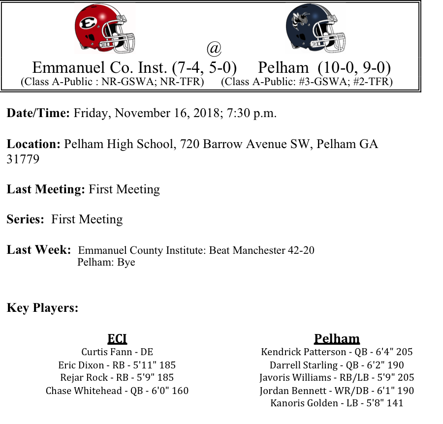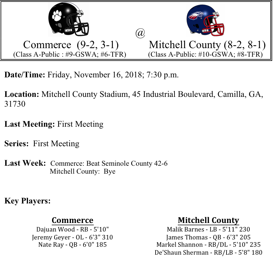 Our first set of week two GHSA-A-Public Playoff previews are listed below. This preview features matchups between Commerce-Mitchell County, Miller County-Irwin County, Chattahoochee County-Greene County, and ECI-Pelham. Congratulations to all of these teams that won their first round game. Best of luck to you all as you play this Friday.