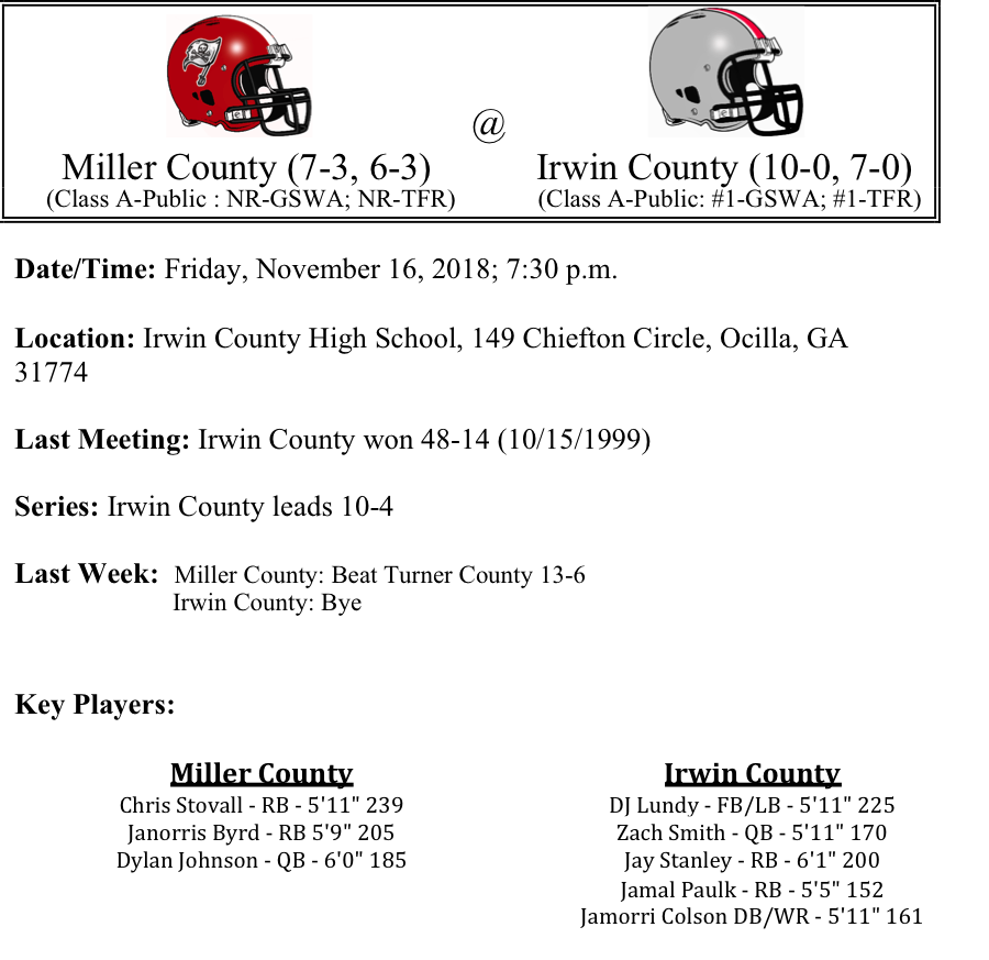 Miller County picked up a first round win last week and will travel to Ocilla to take on the 2017 state runner-up Irwin County Indians. Irwin County is led by RB/LB DJ Lundy. He leads an Irwin County team that has put up some big numbers offensively. The team is averaging 43.8 points per game this season. Irwin County looks as if they’ve been on a mission after falling to Clinch in the title-game last season. Their defense is only giving up 8 points per game this season. If Miller County is going to pull the upset, the running game which has led to their success this season, will need to have one of their better performances. Chris Stovall and Janorris Byrd lead the team in rushing. Stovall has 1,086 yards and 14-TDs and Byrd has 795 yards and 8-TDs. . Even if Miller Count gets things going on the ground, we just don’t know if they are as talented as Irwin County. We think the Indians will win big this week. Give us Irwin County by 23.