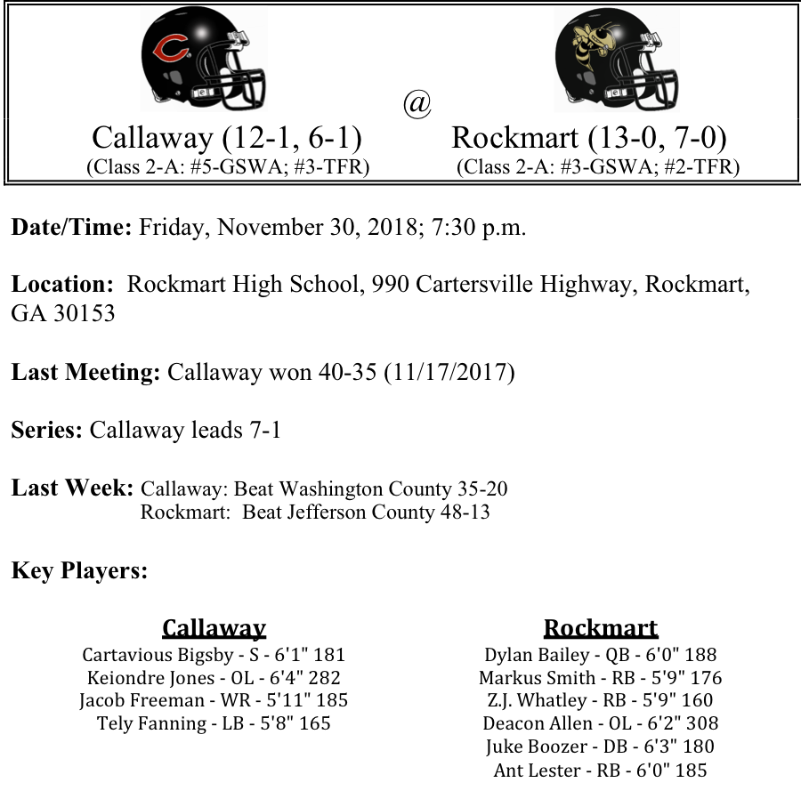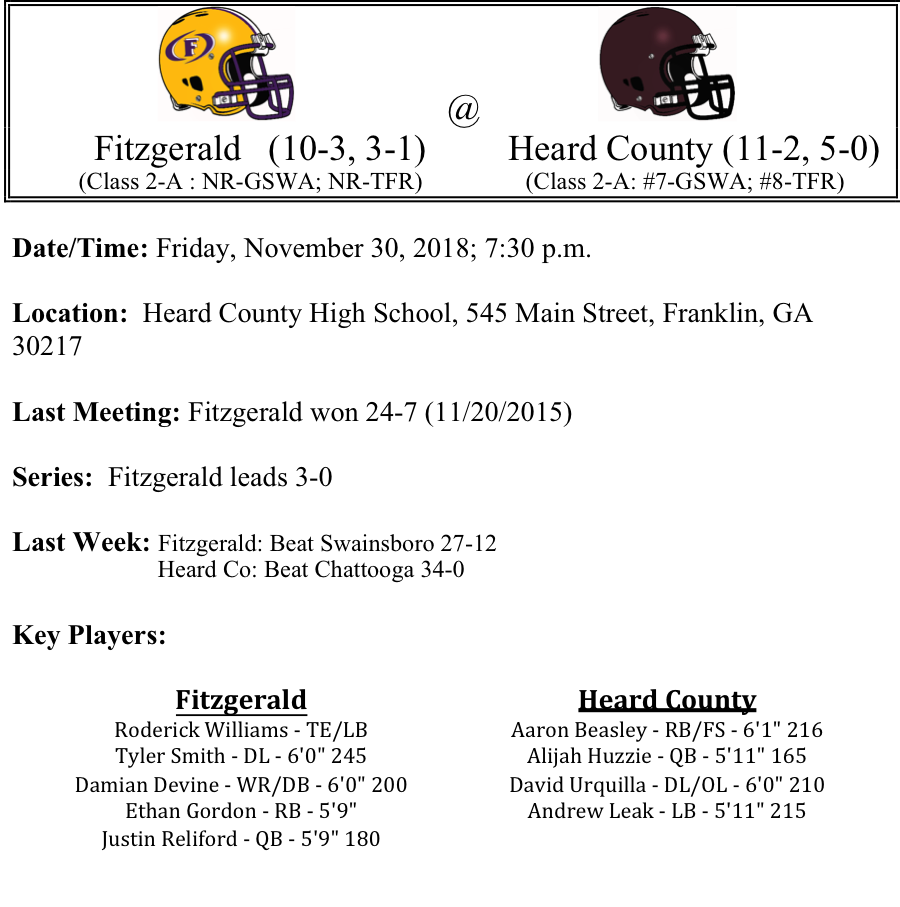 Our GHSA 2-A-Semifinal playoff previews are listed below. This preview features matchups between Fitzgerald-Heard County and Callaway-Rockmart. There are two teams remaining from Region-5, Heard County and Callaway… Can the Heard County Braves end Fitzgeralds improbable run…Will Rockmart be the next victim for upset minded Callaway…Are we in store for an all Region-5 title game…Best of luck to these final four teams as they compete on Friday night.