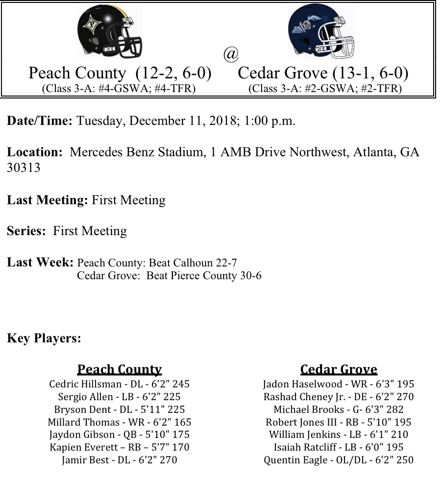 Our GHSA 3-A-Finals playoff preview is listed below. The Cedar Grove Saints will face the Peach County Trojans. The Trojans are back in the finals for the second consecutive year, while the Saints are in the finals for the second time in three seasons. Will this be an offensive explosion or a defensive struggle. Best of luck to both Cedar Grove and Peach County and their respective communities as they compete on Tuesday, December 11th.