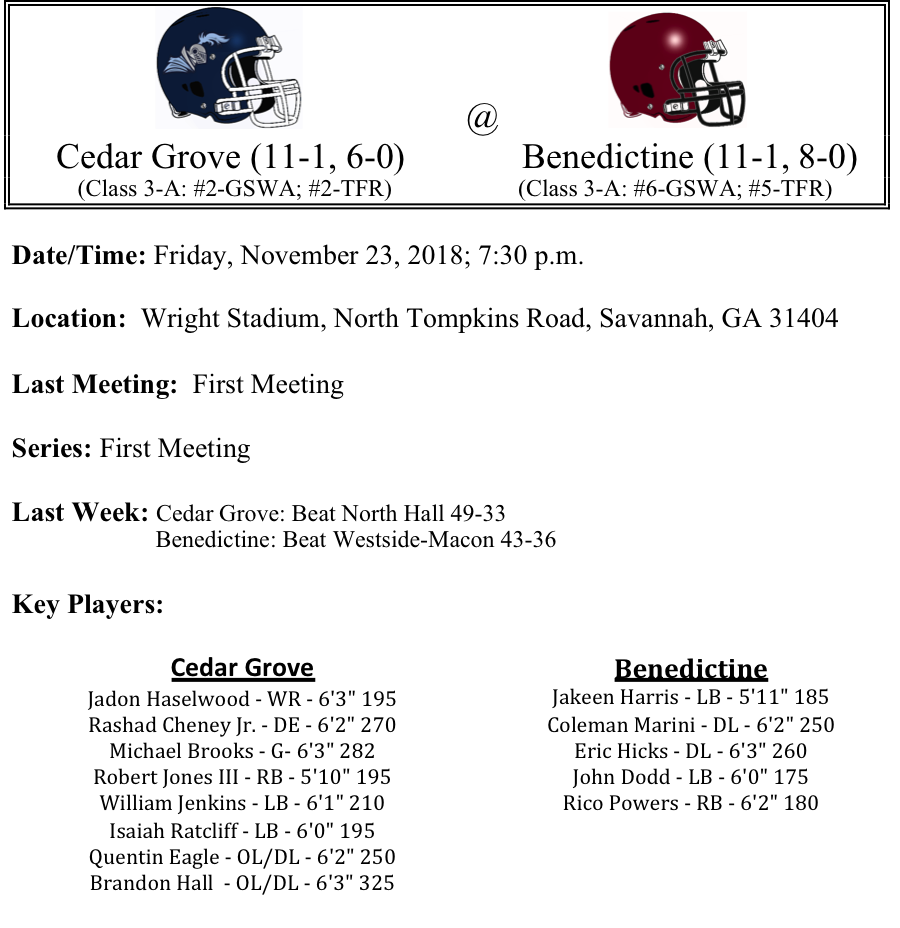 The Cedar Grove Saints will make their fourth consecutive trip to the quarterfinals. They will face the Benedictine Cadets. Neither team has lost a game to a class AAA opponent this season. The Saints boast the nation’s No. 1 wide receiver prospect in Jadon Haselwood. But they are not just a one man show. Austin Smith and Kendall Boney have combined to pass for over 2,100 yards and 29-TDs, while Robert Jones leads the team in rushing with 870 yards and 10-TDs. Haselwood and Rashard Jordan have combined for over 1,400 yards receiving and 18 receiving TDs. On defense for the Saints, Dante Walker leads the way with 8.5 sacks, while Haselwood has picked off 3 passes in the secondary. Meanwhile, down in Savannah, Benedictine has taken much of the success they’ve had in AA and continued that as the moved to Class AAA play this season. Backs Rico Powers (133 yards, 3 total TDs) and Jakeen Harris (143 yards, 3-TDs) lead the offensive attack in last weeks win over Westside, Macon. Benedictine is averaging 41.4 points per game. While the Cadets defense is allowing only 10.5 points per game. Cedar Grove is one of our picks to be in the state title game, we like the Saints by a touchdown on the road over Benedictine this week.