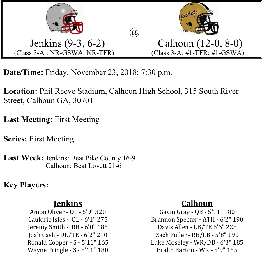 The Jenkins Warriors are in the quarterfinals for the third time in school history. They are one of two teams still alive from Region-3. (The other is Benedictine.) The Warriors will travel to Calhoun to take on perennial power, Calhoun. Jenkins is led by Jeremy Smith on offense. He’s well over the 1,000 yard mark rushing on the season and has 9-TDs. Meanwhile, Calhoun has made it to the quarterfinals for eleven consecutive seasons. The Jackets have been playing at a high level all season. They shook off a slow first half start against Ridgeland in week one and really haven’t looked back since. The Jackets are winners of their last 24 games. On the season, they are averaging 46.4 points per game, while their defense is only allowing 7.1 points per game. Their smallest margin of victory this season was last week’s 15-point win over Lovett. Will the long bus ride to Jenkins put them behind the 8-ball? We think so, along with Calhoun’s defense. We like the Jackets by 20.