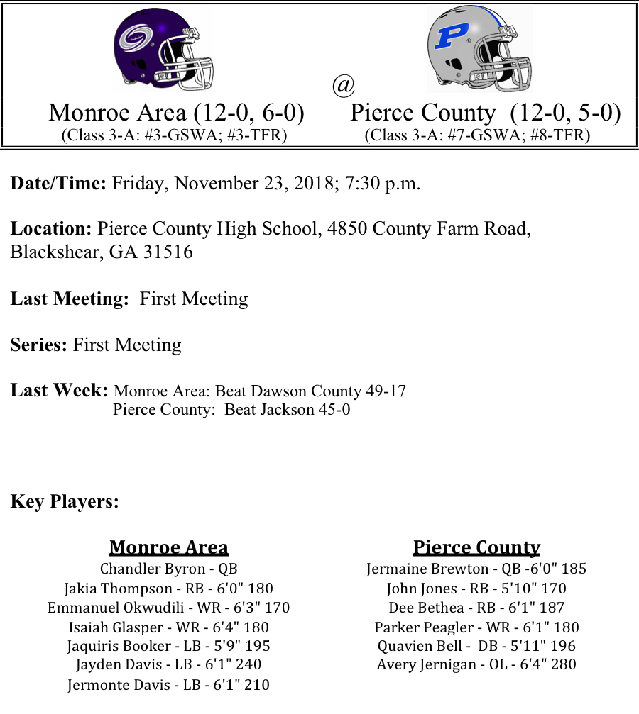 Our GHSA 3-A-Quarterfinal playoff previews are listed below. This preview features matchups between Monroe Area-Pierce County, Cedar Grove-Benedictine, Westminster-Peach County, and Jenkins-Calhoun. Congratulations to these final 8 teams on a successful season. Best of luck to you all as you compete this Friday.