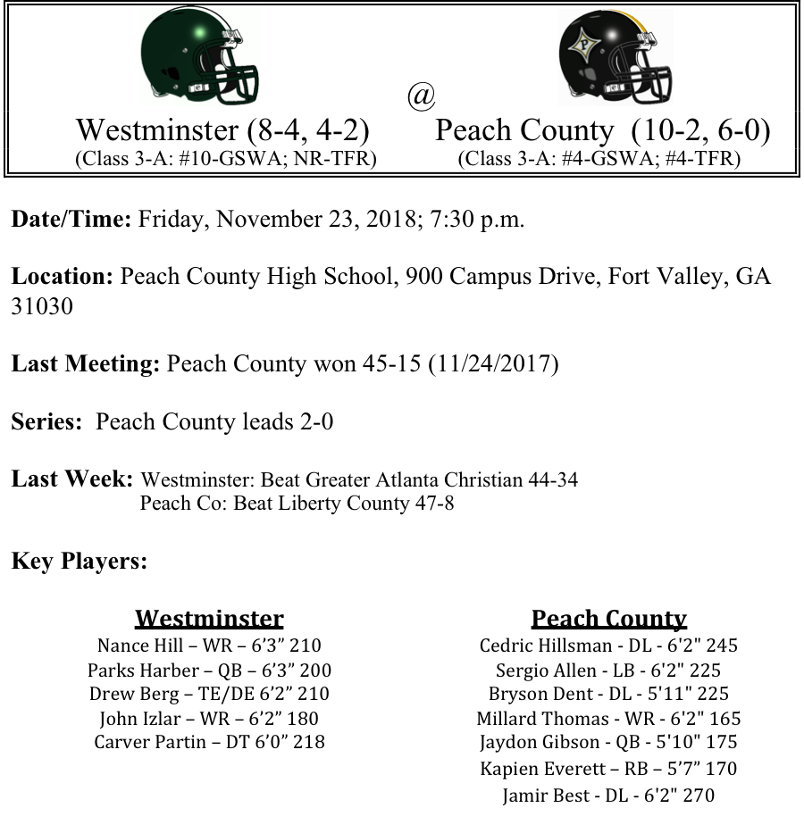 The Westminster Wildcats find themselves back in the quarterfinals for the fifth consecutive season. Last week, they picked up their second win of the season against Greater Atlanta Christian. Westminster has been up and down this season. In their 8 wins, their offense is averaging 40.1 points per game, in their 4 losses, they are only averaging 11.7 points per game. Their opponent this week is Peach County. The Trojans have ended Westminster’s season in back to back years. Peach County is back in the quarterfinals, a place where they certainly feel comfortable. As we’ve mentioned before, there is not the same star power in terms of top ranked recruits, but the Trojans are well coached and still a very talented team. Quarterback Jaydon Gibson has passed for 1,704 yards and 17-TDs, while Kapien Everett has rushed for 557 yards and 12-TDs to lead the Trojans ground game. Last week, junior, Tijah Woolfolk rushed for 156 yards and 3-TDs. Woolfolk has 457 yards rushing in 4 games this season. We think that Peach will be able to control the line of scrimmage in this matchup, but this won’t be a runaway; Trojans by 3.