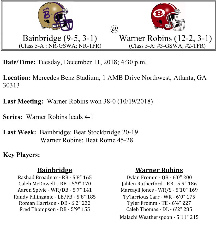 Our GHSA 5-A-Finals playoff previews is listed below. We are down to two teams and like Class 6-A, they both come from Region-1. This game will feature a rematch between Bainbridge and Warner Robins. The Bainbridge Bearcats have reeled off six straight victories in what some might see as an improbable run. Bainbridge is in the finals for the first time since 1982. That was the only time they have won a state title. Warner Robins features one of the state’s top quarterback and receiver combinations, in Dylan Fromm and Marcayll Jones. Can Bainbridge ground the aerial attack of the Demons? We will know for sure in one week. Best of luck to both Bainbridge and Warner Robins and their respective communities as they compete on Tuesday, December 11th.