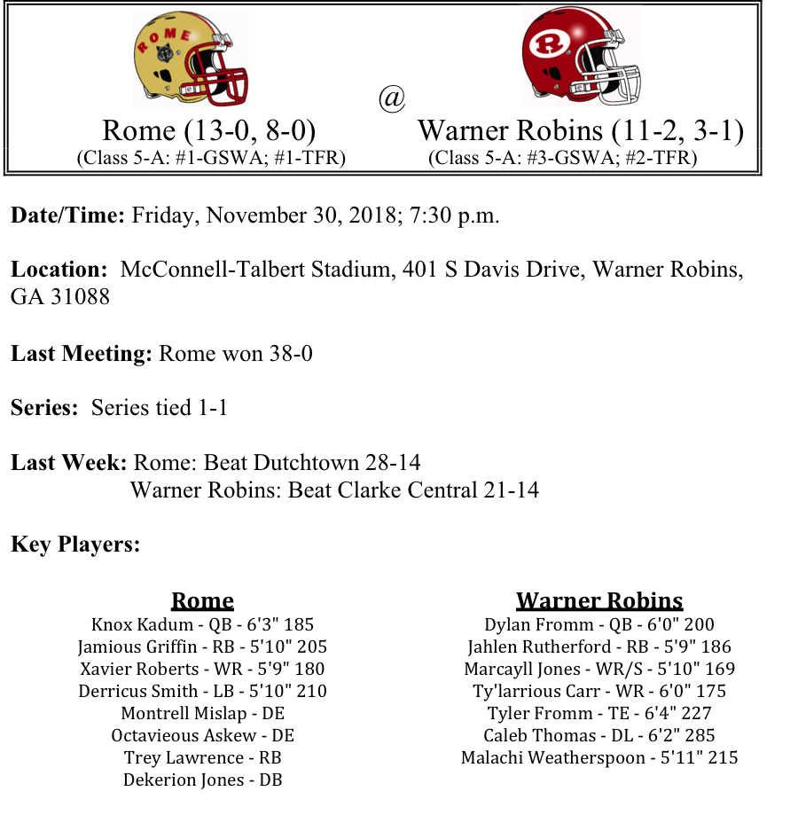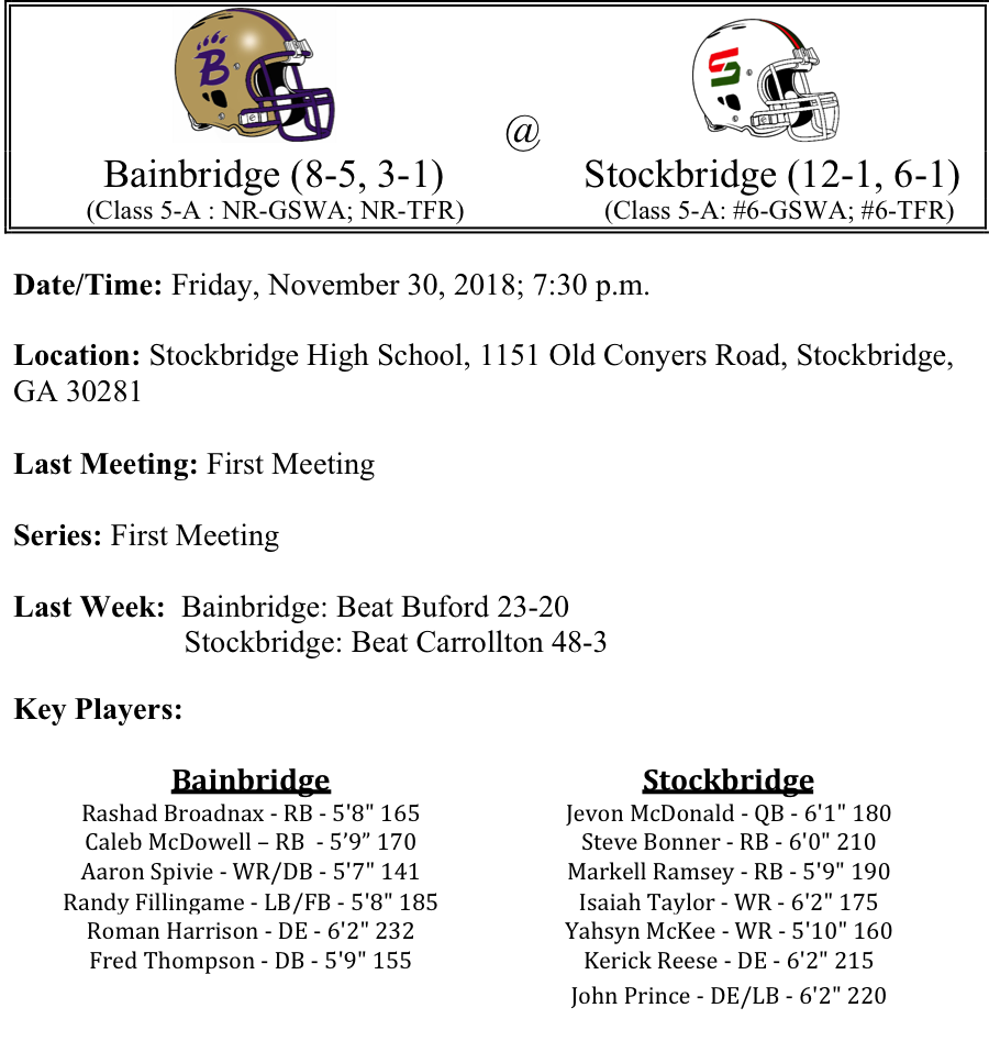 Our GHSA 5-A-Semifinal playoff previews are listed below. This preview features matchups between Bainbridge-Stockbridge and Rome-Warner Robins. Some things of note this week…Like Class 6-A and 7-A, we could have an all Region-1 final…Bainbridge has made a great run in the playoffs, certainly surprising us here at the TFR…Can Warner Robins avenge last seasons state championship loss…They will get a chance to do it in front of the home crowd this Friday. Best of luck to these final four teams as they compete on Friday night.