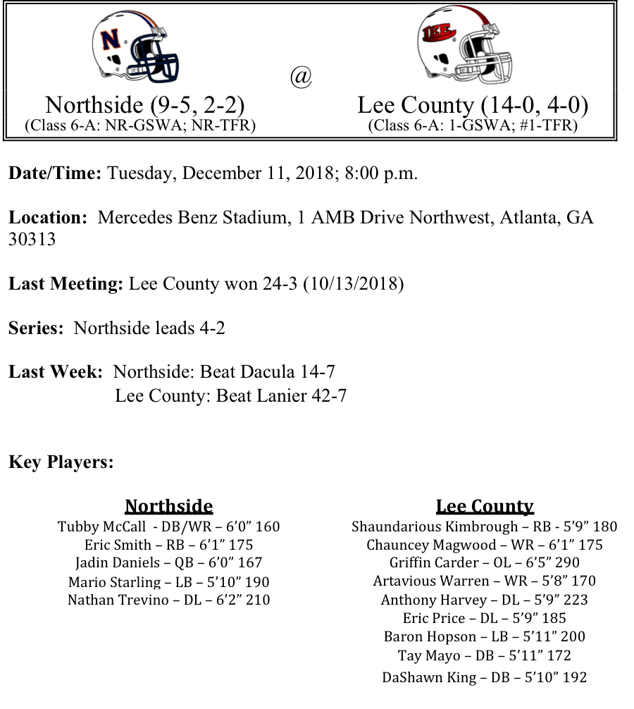 Our GHSA 6-A-Finals playoff previews is listed below. We are down to two teams and they both come from Region-1. This game will feature a rematch between Lee County and Northside, Warner Robins. Lee County won the first tilt 24-7 earlier this season. The Lee County Trojans will be looking to repeat as state champions. This is the second consecutive year that it has been an all Region-1 state final. This is probably the toughest region in the state, regardless of classification. Best of luck to these schools and their respective communities as they compete on Tuesday, December 11th.