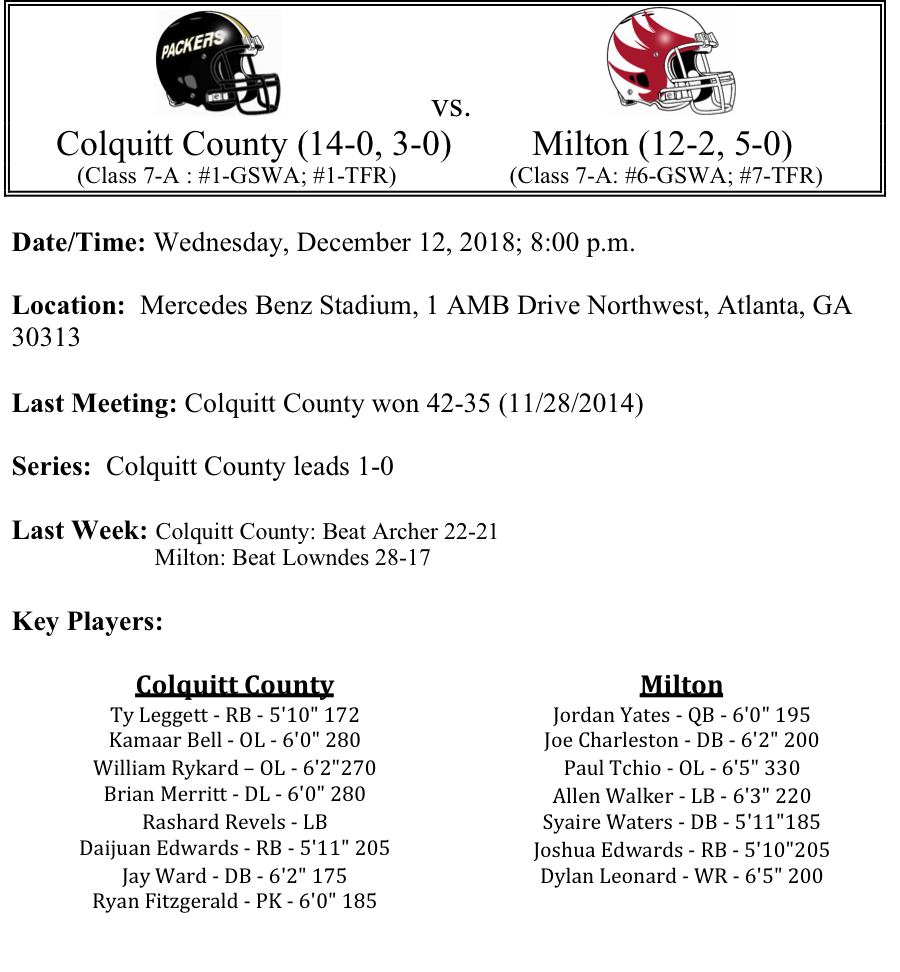 Our GHSA 7-A-Finals playoff previews is listed below. We are down to two teams after a long grueling season that started well back into summer, and for most teams, a season that probably started when the 2017 season ended. The Milton Eagles and Colquitt County Packers are the two teams left standing in Georgia’s highest classification. The Eagles are playing for their first title in school history, while Colquitt County has been a mainstay over the past few years. Best of luck to these schools and their respective communities as they compete on Wednesday, December 12th.