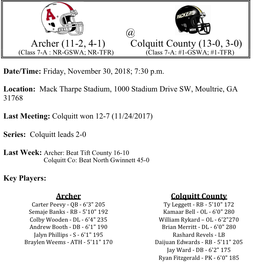 Archer edged Tift County last week in overtime to advance to the semifinals for the second time in school history. Semaje Banks 2-yard touchdown run in overtime proved to be the game winner. Banks finished the game with 118 yards and 2-TDs. On the season, the Archer offense is averaging 36 points per game, so there is certainly some explosiveness for the Tigers. Their defense is allowing just over two touchdowns a game on average. Meanwhile, it seemed to be business as usual for Colquitt County, as they avenged last year’s state title loss at the hands of North Gwinnett. The Packers blanked the defending champs 45-0. Ty Leggett led the way with 137 yards on just 9 carries and scored 5 total touchdowns, (4-rushing and 1-receiving). Quarterback Jaycee Harden passed for 220 yards, completing 70% of his passes in the win. While it was only the second shutout that Rashard Revels, Brian Merritt and company has pitched in 2018; the Packers defense is only allowing 9.3 points per game. We think the Packers will have another big game defensively this week. We like Colquitt by 16.