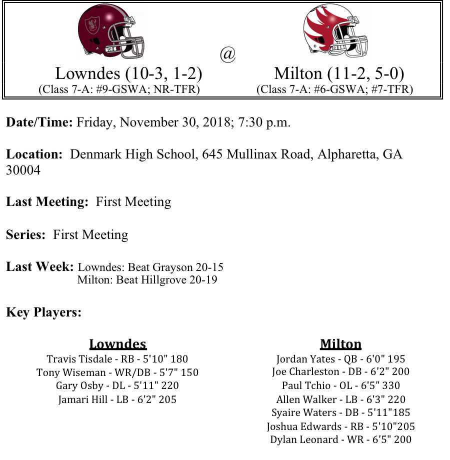Our GHSA 7-A-Semifinal playoff previews are listed below. This preview features matchups between Lowndes-Milton and Archer-Colquitt County. Some things of note this week…Milton is making their first semi-finals appearance…Will it be an all Region-1 final…No matter, there will be a new state champion in 7-A as the defending champ was dethroned last week. Best of luck to these final four teams as they compete on Friday night.