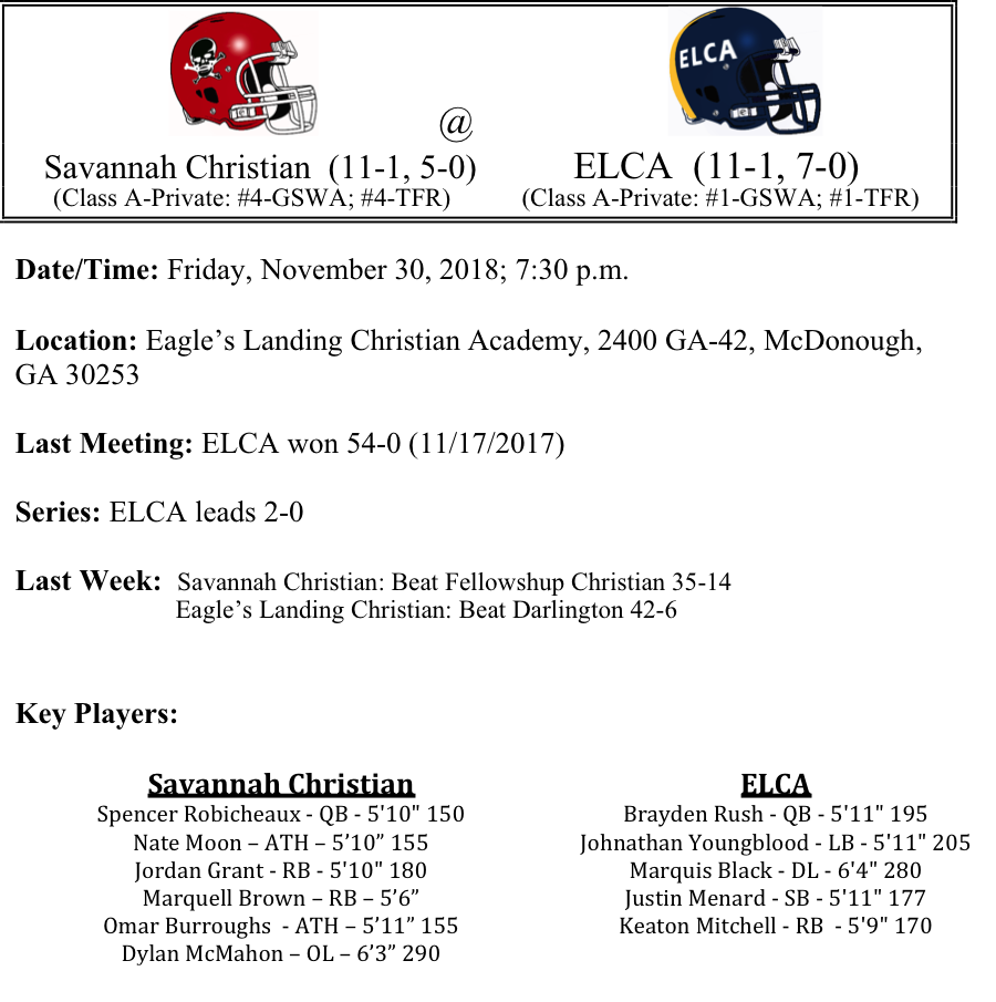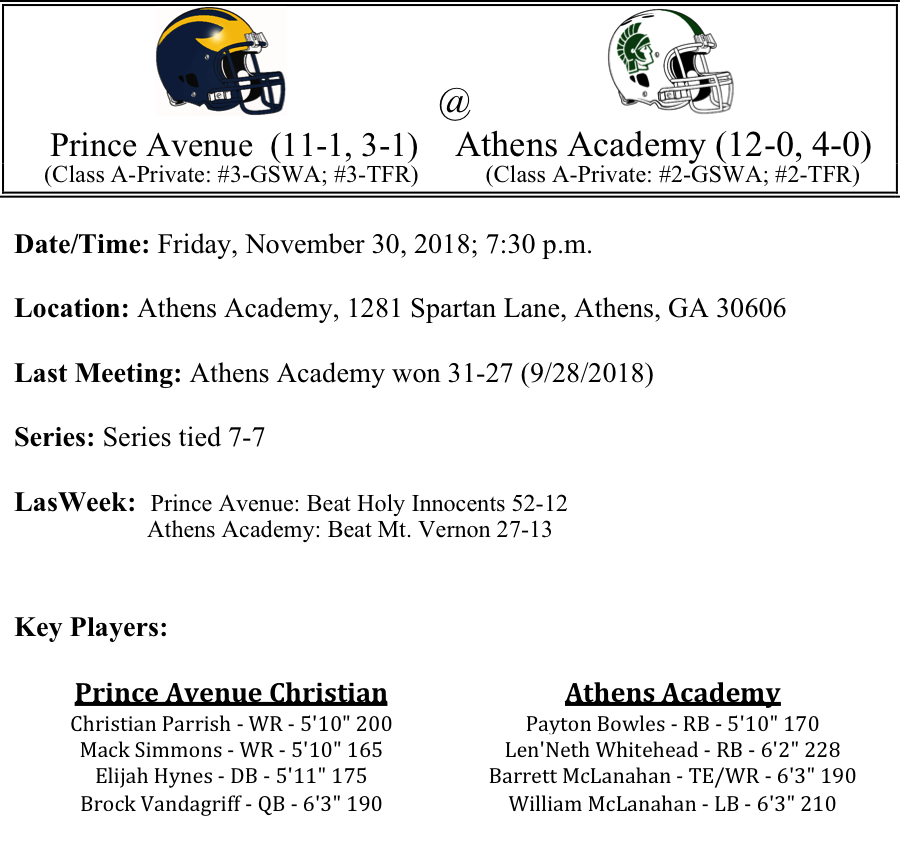 Our GHSA A-Private-Semifinal playoff previews are listed below. This preview features matchups between Prince Avenue Christian-Athens Christian and Savannah Christian-Eagle’s Landing Christian…The seeds have held to form thus far…Will ELCA win their 4th consecutive state title. Can Athen’s Academy beat Prince Avenue for the second time this season…Or perhaps Savannah Christian will be the talk of Class-A-Private…Best of luck to these final four teams as they compete on Friday night.