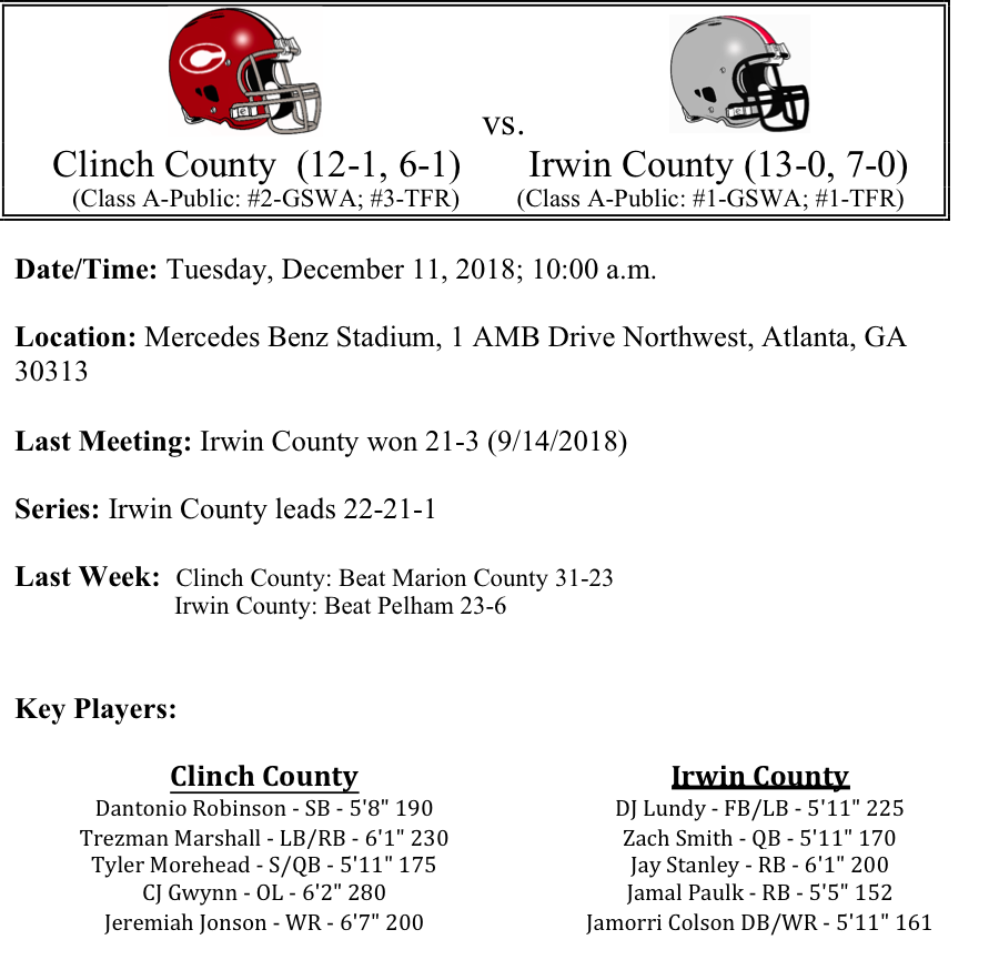 Our GHSA Class-A-Public-Finals championship preview is listed below. Clinch County and Irwin County will face off for the second time this season and for the second year in a row, the two teams will meet in the state title game. Last season Irwin won the regular season match but Clinch won the state title game. Irwin County has again won the regular season title. Will history repeat itself of will Irwin County bring home their first title since 1975. Best of luck to both Clinch County and Irwin County and their respective communities as they compete on Tuesday, December 11th.