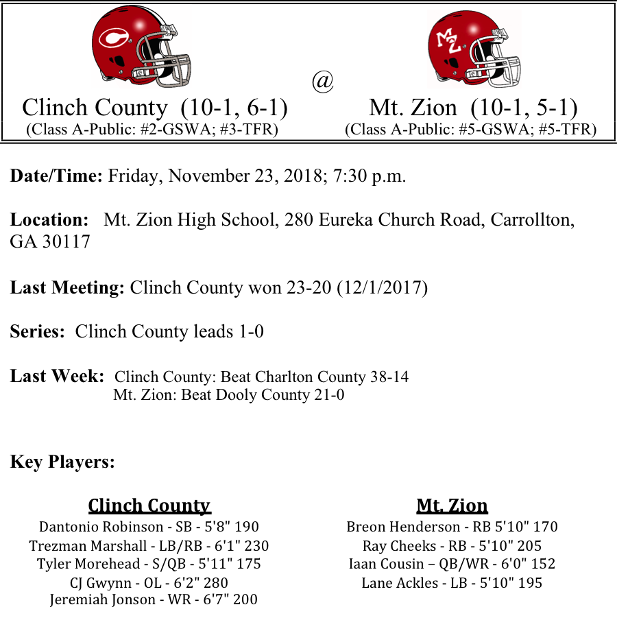 The Clinch County Panthers will log some 550+ miles (round trip) this week as the travel out to Mt. Zion Carroll. Last year it was Clinch who ended the Eagles season in the semifinals. Mt. Zion will be looking to return the favor. The Eagles are in the quarterfinals for the fourth time in five years. A win would give them their second consecutive trip to the semifinals. The Eagles rely primarily on the run, but Iaan Cousin is an effective passer in certain situations. Clinch County has won seven straight games since a loss back in mid-September to No. 1 ranked Irwin County. Clinch is averaging 36.7 points per game, while the defense is allowing 13.4 points per game. Both Clinch and Mt. Zion have a common opponent in Dooly County. Both teams beat the Bobcats; Clinch by 34 and Mt. Zion by 21. We think that Trezman Marshall and the Clinch County Panthers will leave Carroll County with a win. We like Clinch County by 9.