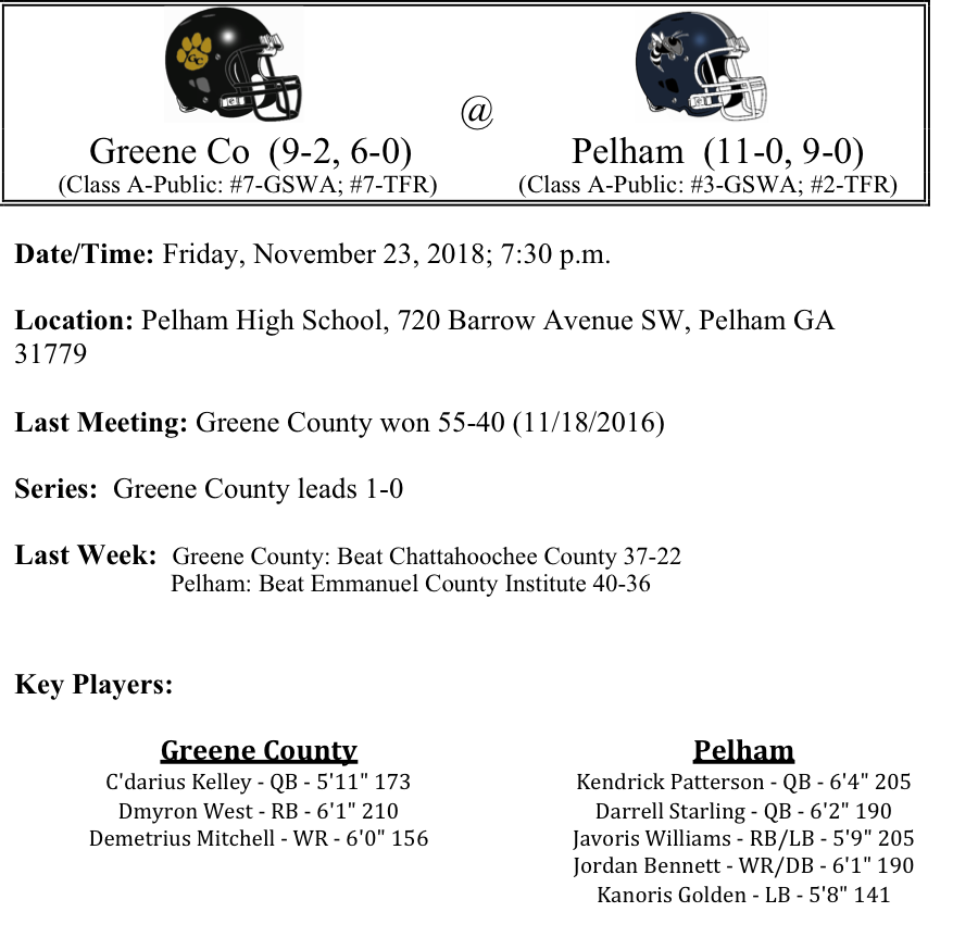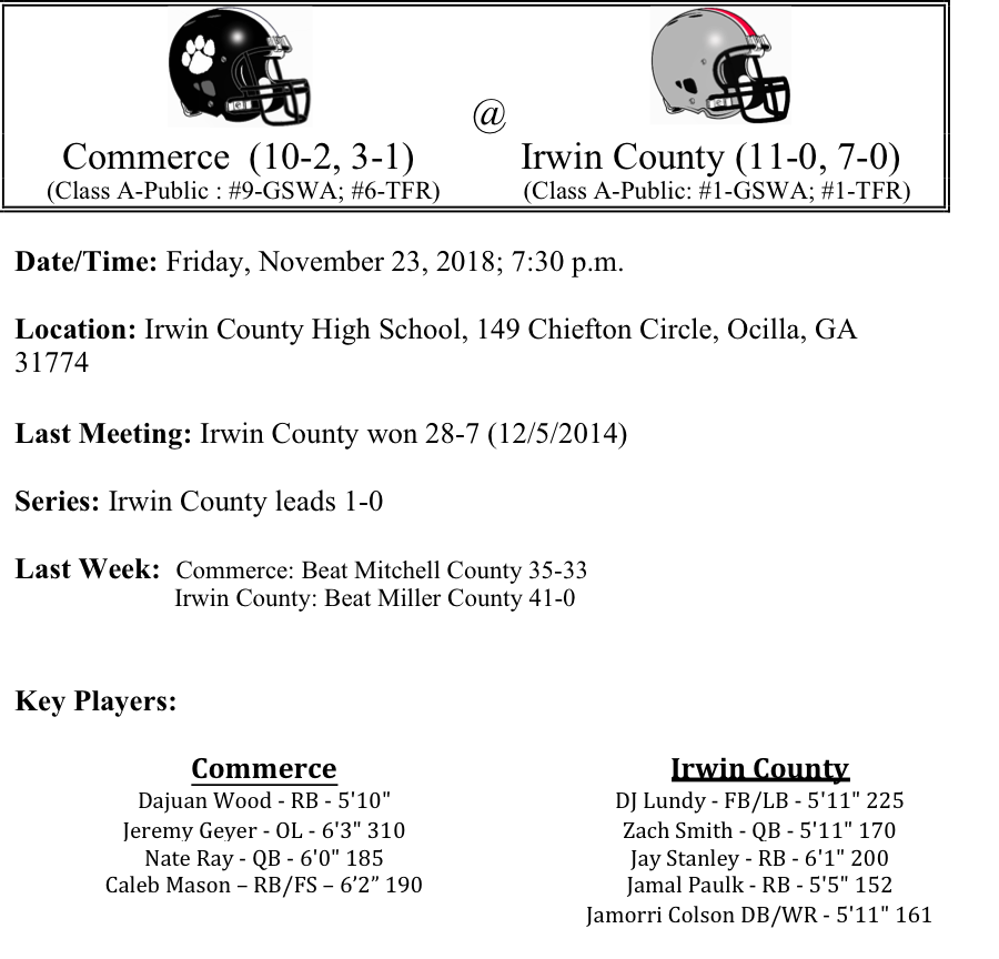 Our GHSA Class-A-Public-Quarterfinal playoff previews are listed below. This preview features matchups between Commerce-Irwin County, Greene County-Pelham, Commerce-Marion County, and Clinch County-Mt. Zion, Carroll. Congratulations to these final 8 teams on a successful season. Best of luck to you all as you compete this Friday.
