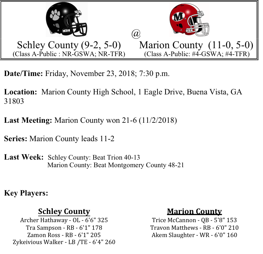 There is an old saying that “the third time is a charm”. The Schley County Wildcats are hoping that is the case, as they will face the Marion County Eagles for the 3rd time this season. Marion County won the first two matchups 28-7 and 21-6. Last week against Montgomery County, Marion’s Trice McCannon passed for 138 yards and rushed for 223 yards with 4-total TDs. The 223-yard rushing performance put McCannon over the 1,000-yard mark on the season. As a team, the Eagles have rushed for over 3,200 yards on the season, led by Travon Matthews with 1,540 yards. The Schley County Wildcats had another big game on the ground. As a team, the Wildcats rushed fro 321 yards and scored 6-rushing TDs. Schley has rushed for over 3,000 yards this season. Tra Sampson and Zamon Ross have led the way on the ground this season, with the two backs combining for 2,097 yards and 30-TDs. On the season, Schley is averaging 278 rushing yards per game. In their two losses, Marion is only allowing them 137 yards per game. We think this game will be closer than the first two, but we like Marion by a touchdown.