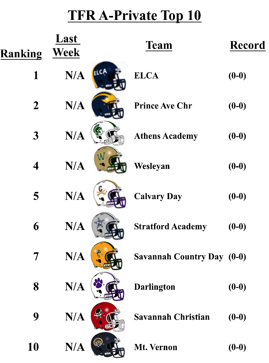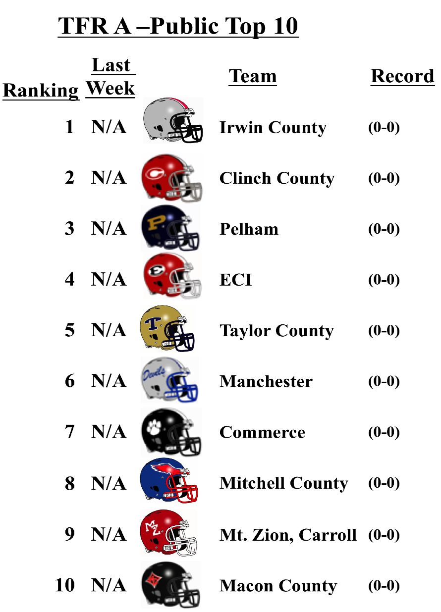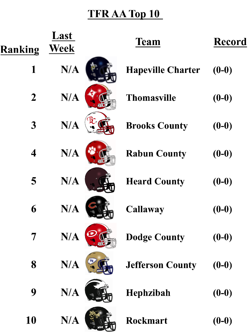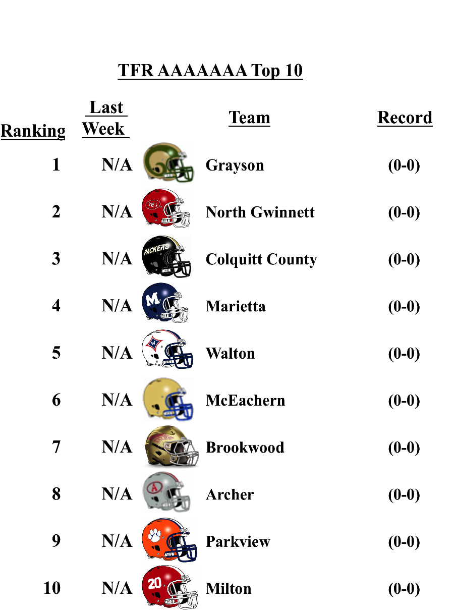 The schools that top the TFR pre-season poll in each classification are: Grayson (7A); Lee County (6A); Rome (5A); Blessed Trinity (4A); Greater Atlanta Christian (3A); Hapeville Charter (2A); Irwin County (A-Public); and Eagle’s Landing Christian Academy (A-Private).