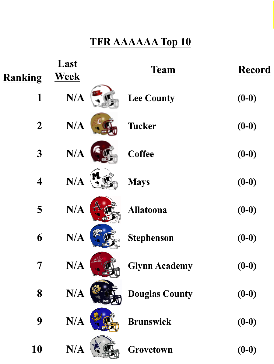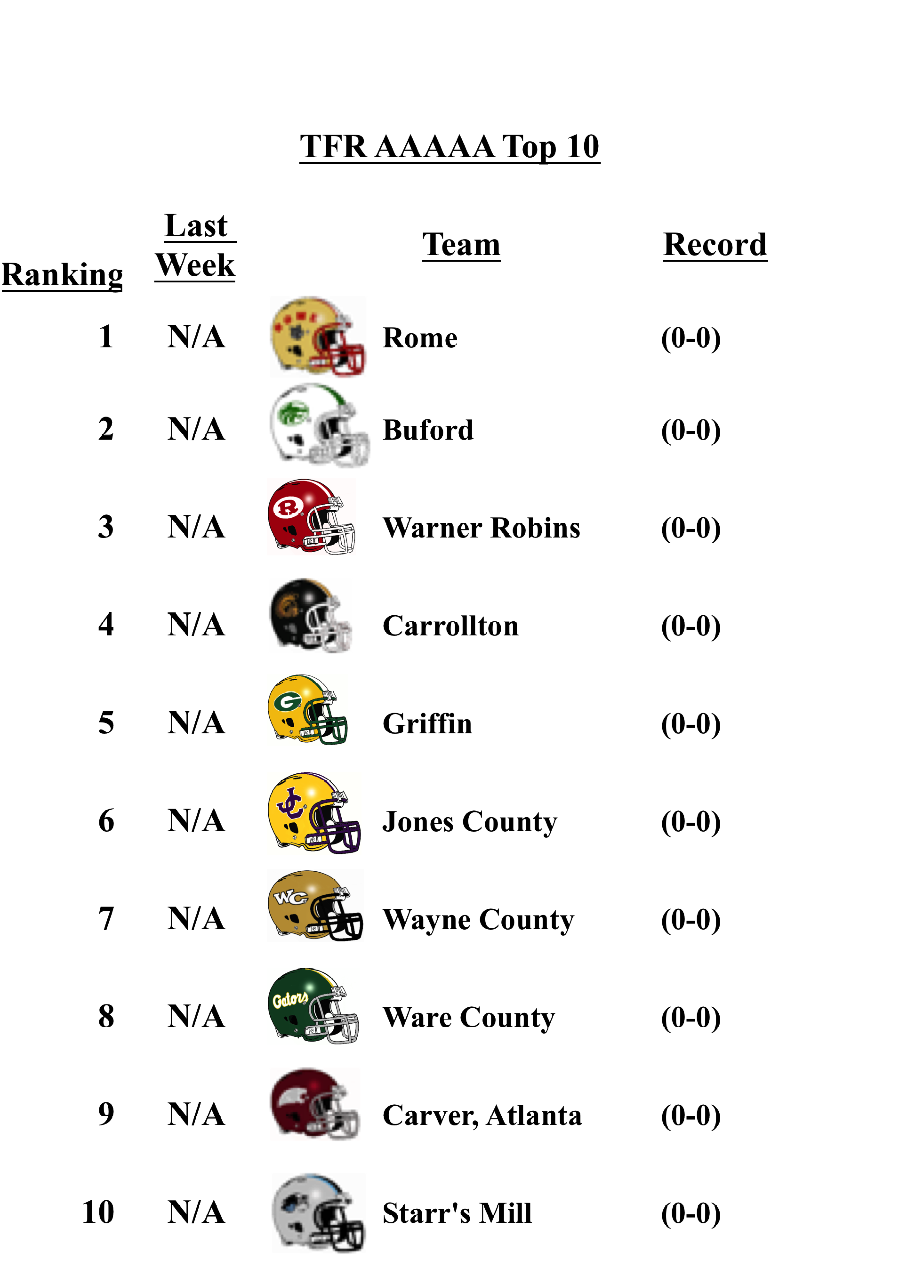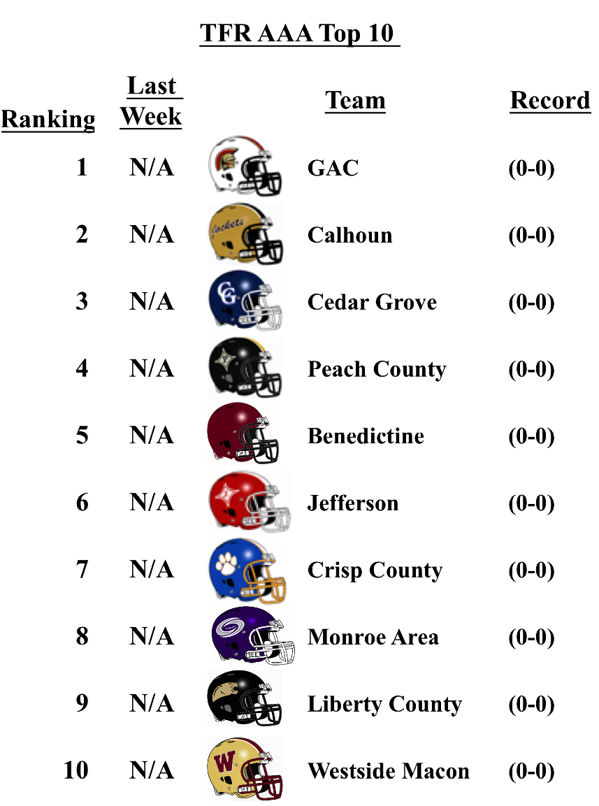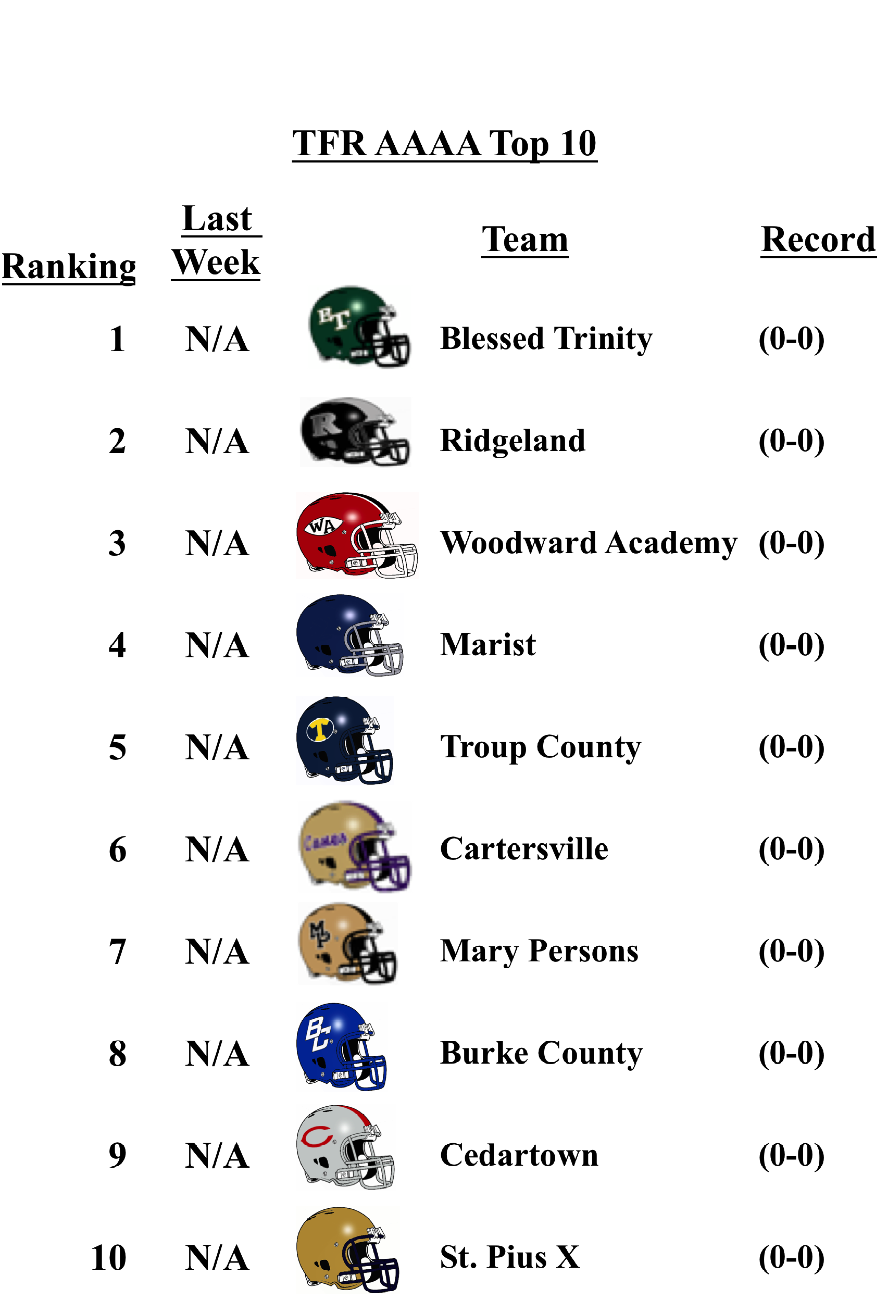 The schools that top the TFR pre-season poll in each classification are: Grayson (7A); Lee County (6A); Rome (5A); Blessed Trinity (4A); Greater Atlanta Christian (3A); Hapeville Charter (2A); Irwin County (A-Public); and Eagle’s Landing Christian Academy (A-Private).
