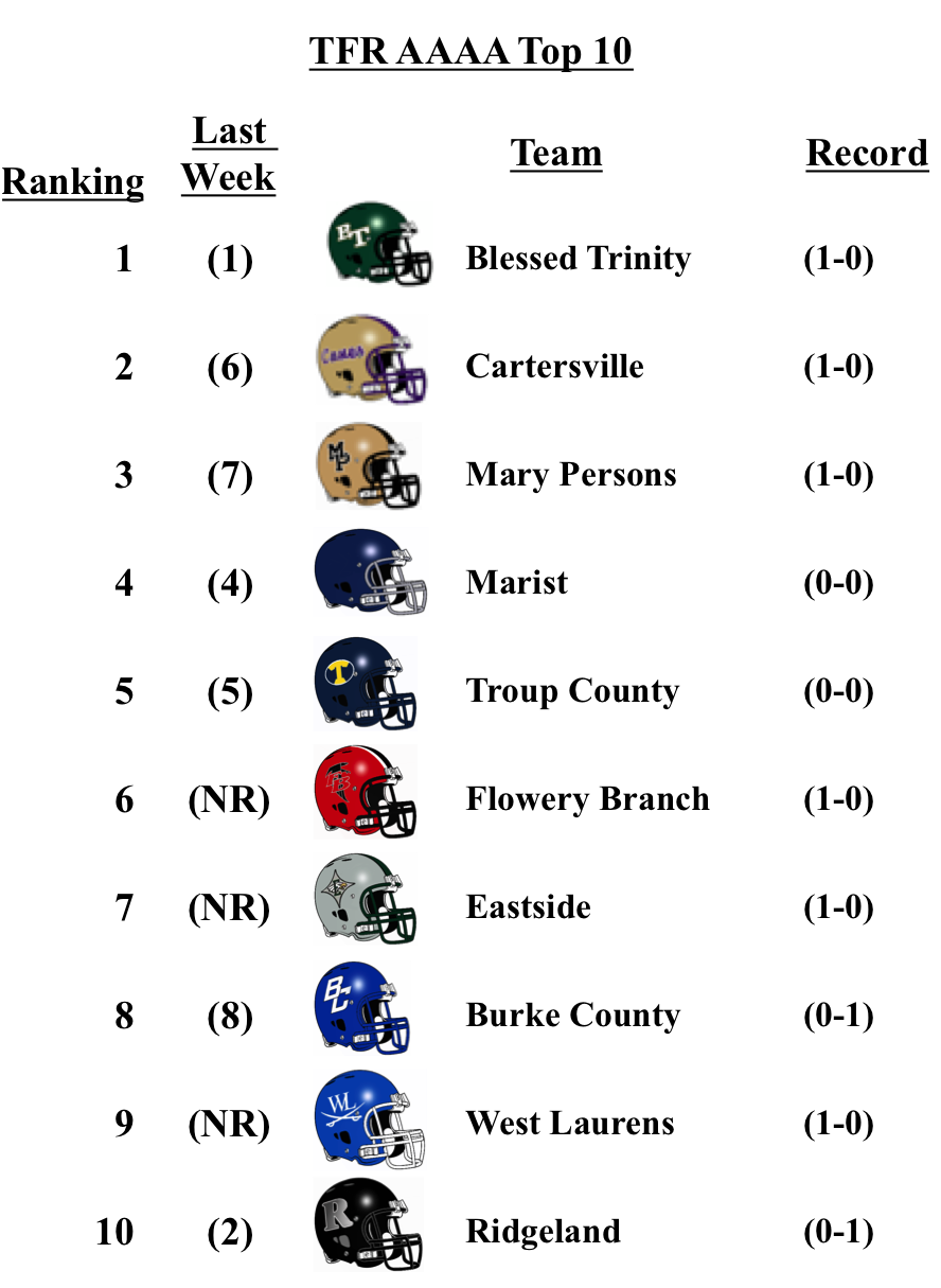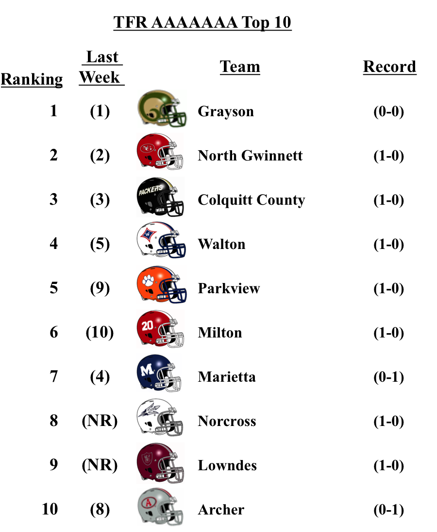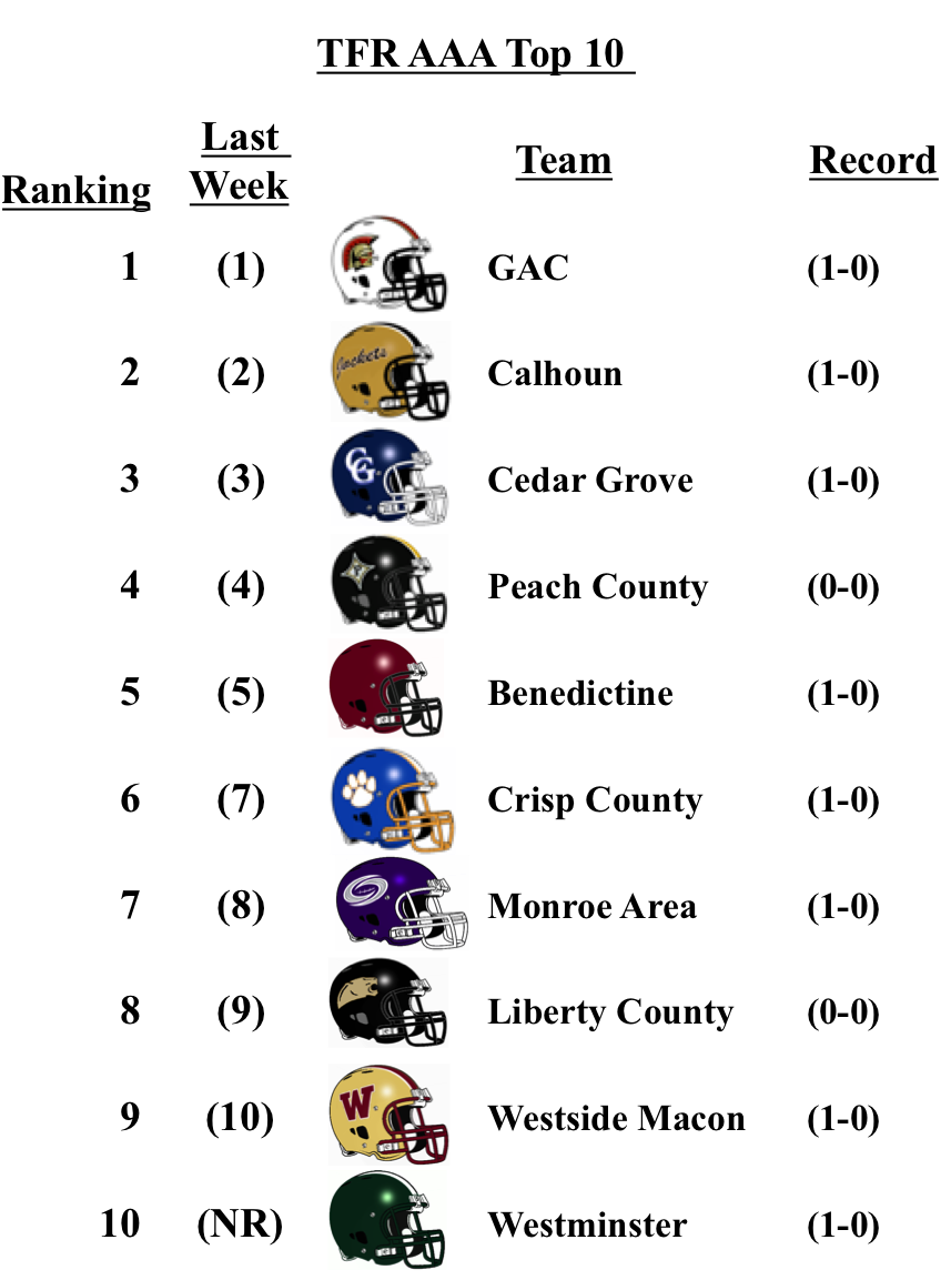 There were no changes for the top teams in each classification from our pre-season poll: Grayson (7A); Lee County (6A); Rome (5A); Blessed Trinity (4A); Greater Atlanta Christian (3A); Hapeville Charter (2A); Irwin County (A-Public); and Eagle’s Landing Christian Academy (A-Private).