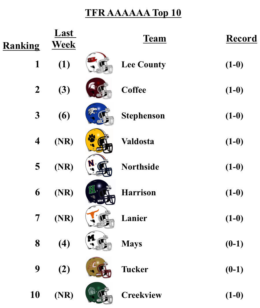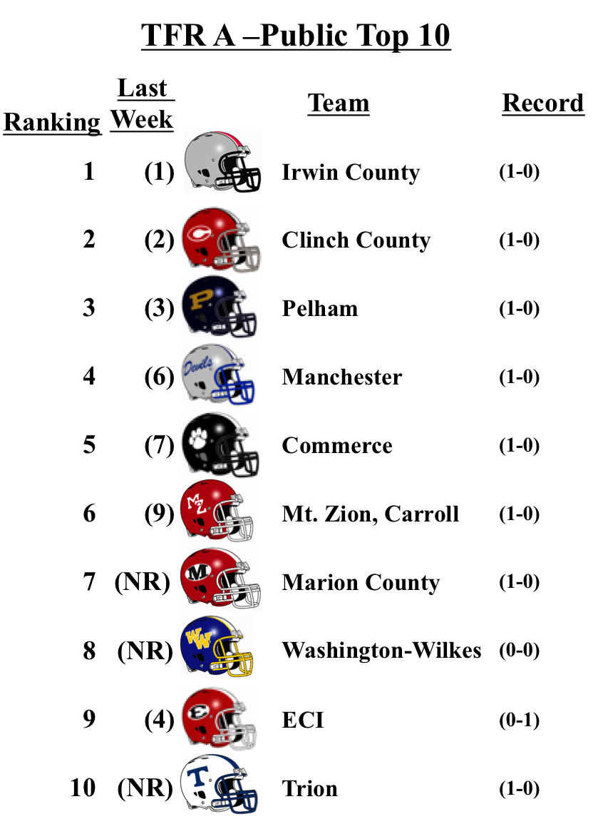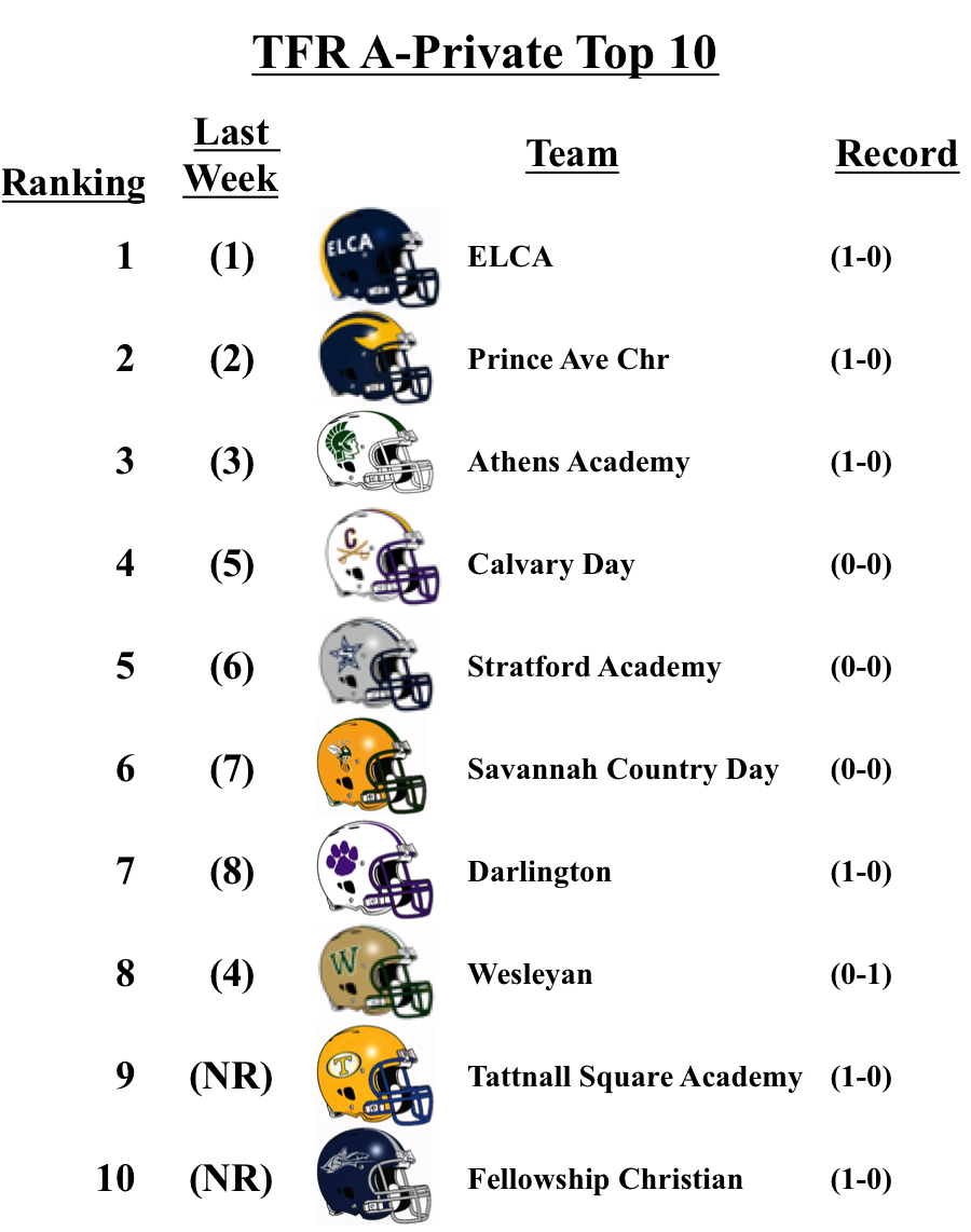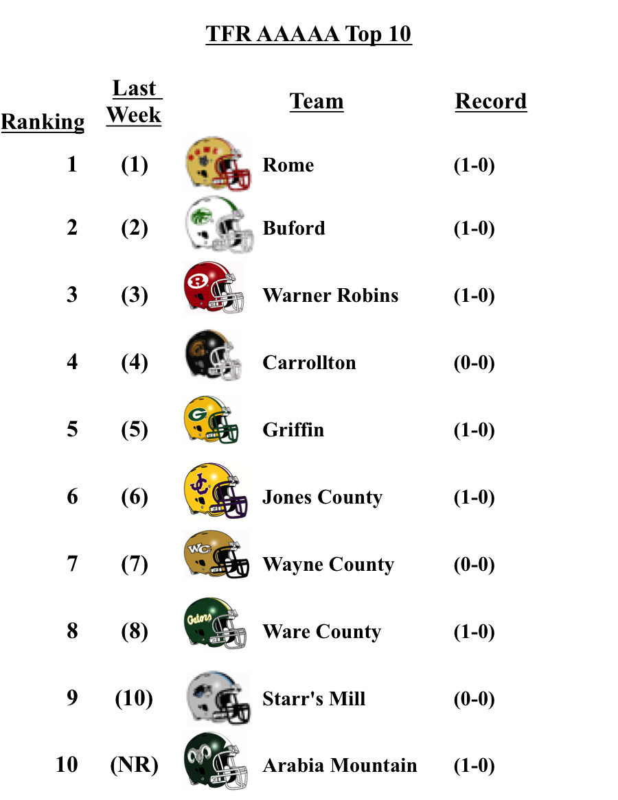 There were no changes for the top teams in each classification from our pre-season poll: Grayson (7A); Lee County (6A); Rome (5A); Blessed Trinity (4A); Greater Atlanta Christian (3A); Hapeville Charter (2A); Irwin County (A-Public); and Eagle’s Landing Christian Academy (A-Private).
