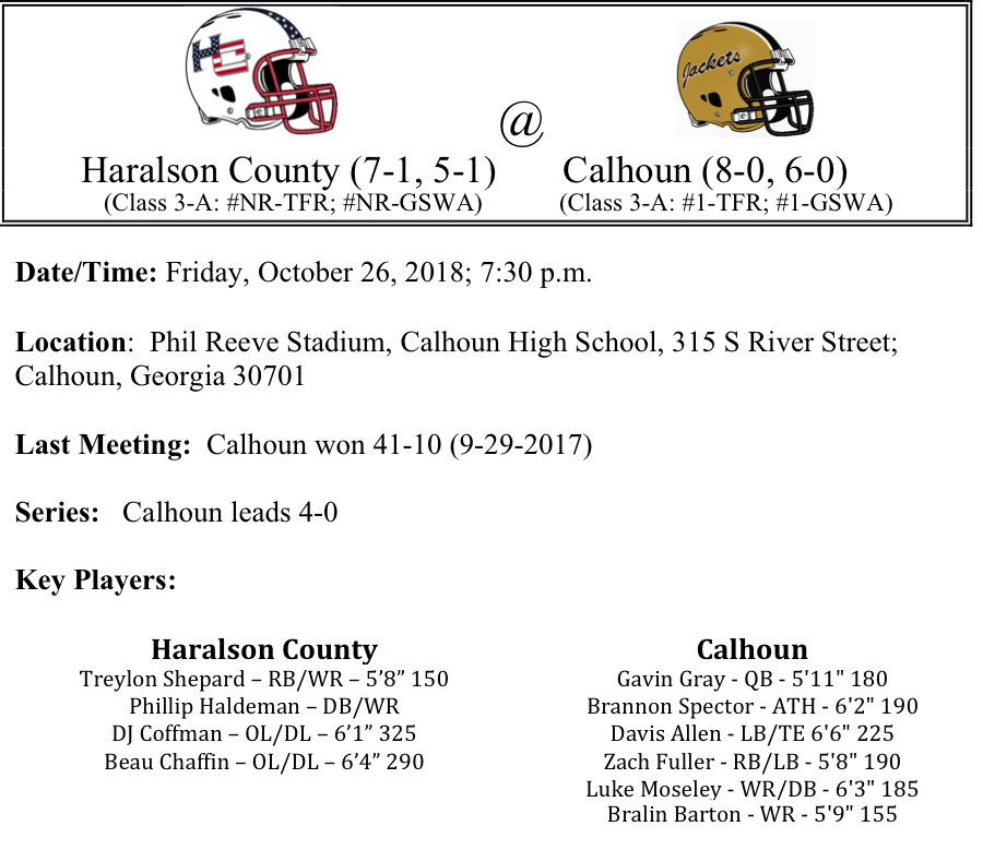Week-11 looks to help settle a lot of the uncertainty in the regions standings. Upstart Haralson county and the states leading rusher, Treylon Sheppard will face the defending region and state champion as they visit Calhoun. A Haralson upset win would shake things up in the region standings…Down in South Georgia, the Valdosta Wildcats will host the Northside Warner-Robins Eagles. The winner will most likely claim the two seed in the region…Just north of Valdosta over in Tifton, the Tift County Blue Devils will host the Colquitt County Packers. The Blue Devils will be the latest team to try to knock off the defending state champs. The winner will be sitting pretty in the region standings…Finally, we take a look at Region 2-3A is Rick Tomberlin has his Pirates on contention for a region title. But the Pierce County Bears have other plans. Regardless of the outcome, both of these teams should host at least one playoff game come November…