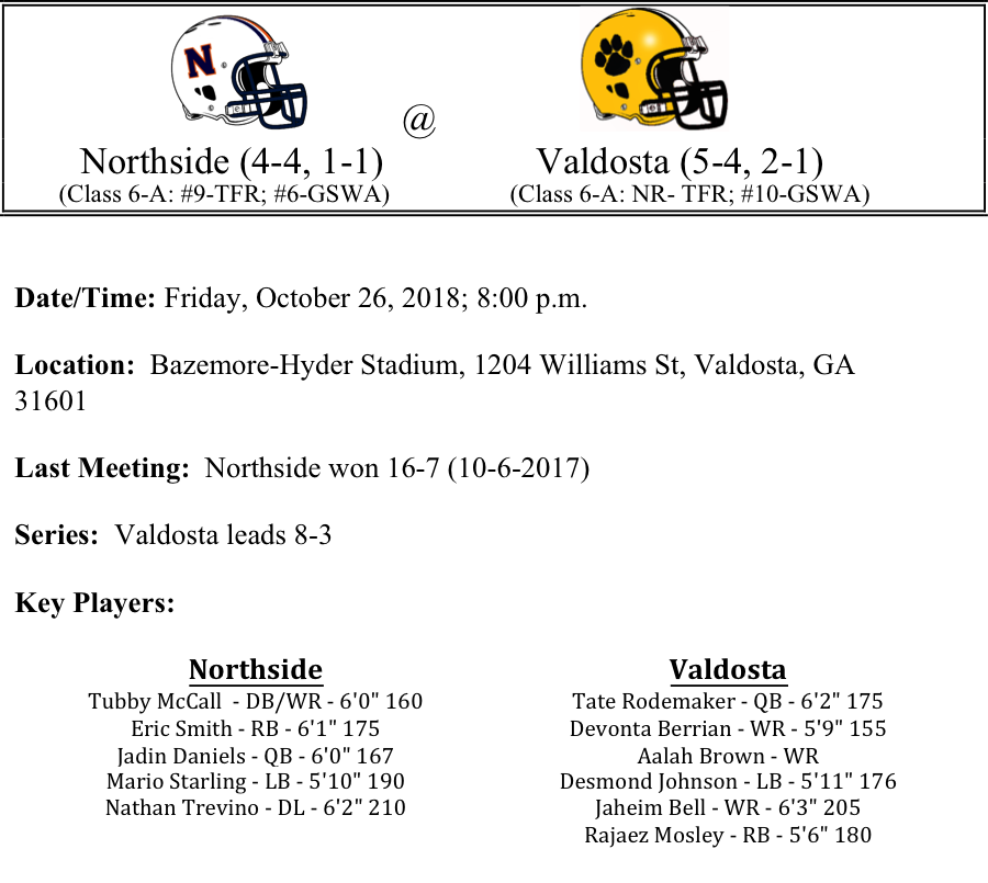 Northside will travel to Valdosta in a game that should determine the number two seed in the region. Both teams have lost to defending state champ, Lee County. Northside has the distinction of the only team to hold Lee County under 30 points of offense this season. The Eagles Jadin Daniels has passed for 937 yards and 10-TDs on the season. Northside favors the run on offense, as Daniels also leads the team in rushing yards with 792 while Eric Smith has rushed for 519 yards on the season with 6-TDs.