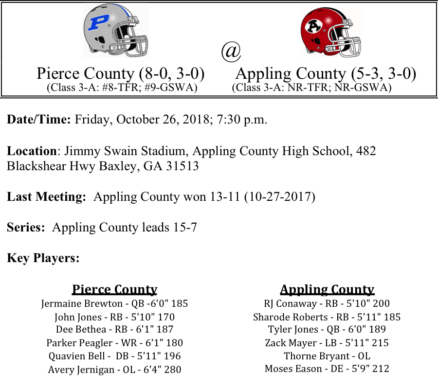 The Pierce County Bears and Appling County Pirates will meet on Friday in a game that should determine the Region-3 champion. The Bears come into the game undefeated and averaging 46.3 points per game on offense and giving up a mere 5.3 points per game on defense. They have shut out five of their opponents on the season. Pierce County is averaging 278.5 yards per game on the ground. Senior running back John Jones leads the way with over 1,000 on the season. Parker Peagler leads the team in receptions, although the Bears do not pass the ball a lot. Quarterback Jermaine Brewton has thrown 15-TDs and only 2 interceptions.