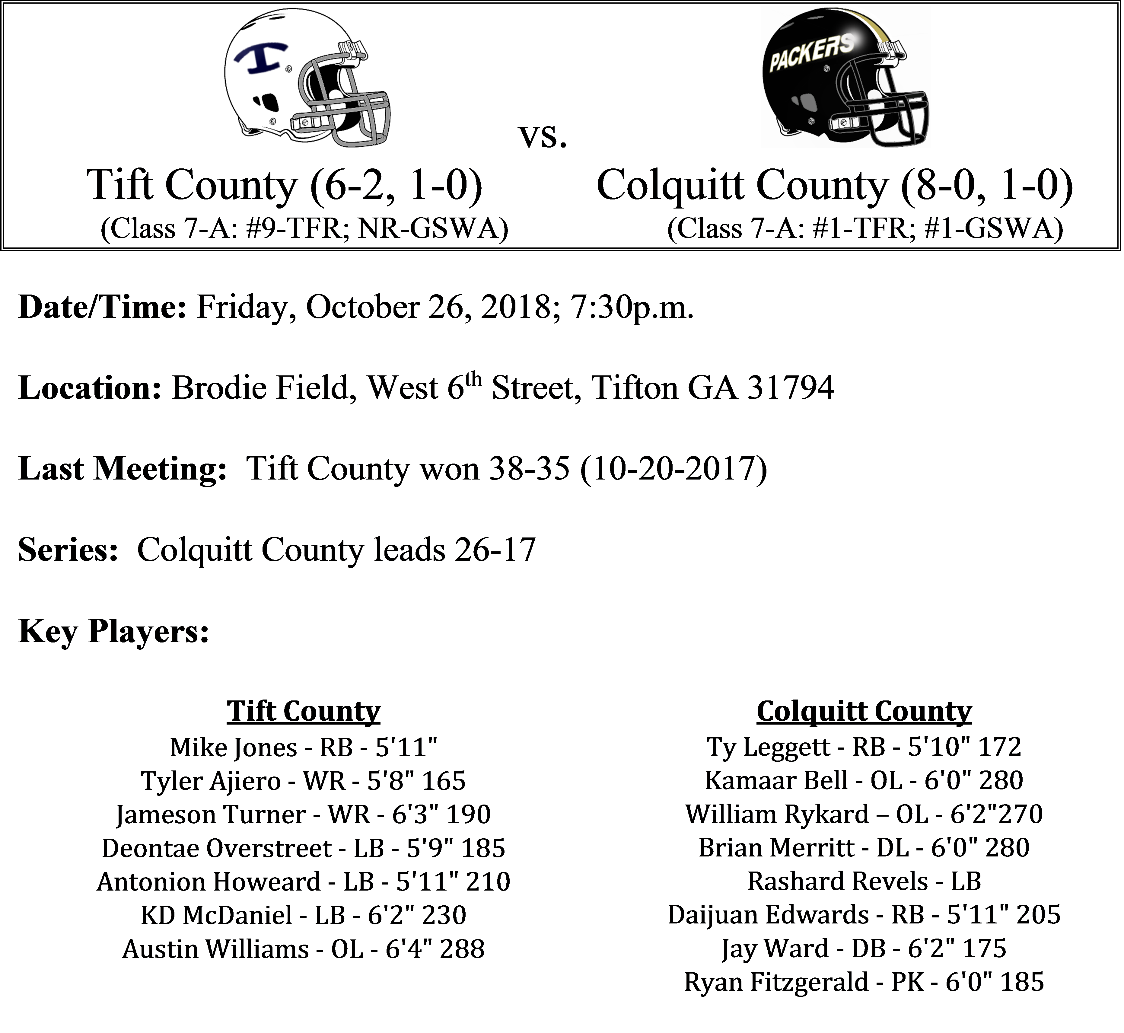 We have mentioned before about Colquitt’s dominance this season. Jaycee Harden has passed for almost 1,300 yards while the combination of Ty Leggett and Daijaun Edwards has rushed for 1,286 yards on the season and 21 rushing TDs. Perhaps we don’t show enough love to their offensive line, anchored by Kamaar Ball and William Rykard. But these guys definitely set the tone for the Packers. The defense is giving up 9.2 points per game. We won’t be surprised if this game is not a blowout. But we think the Packers are just to strong at home this week. Pack by 14.