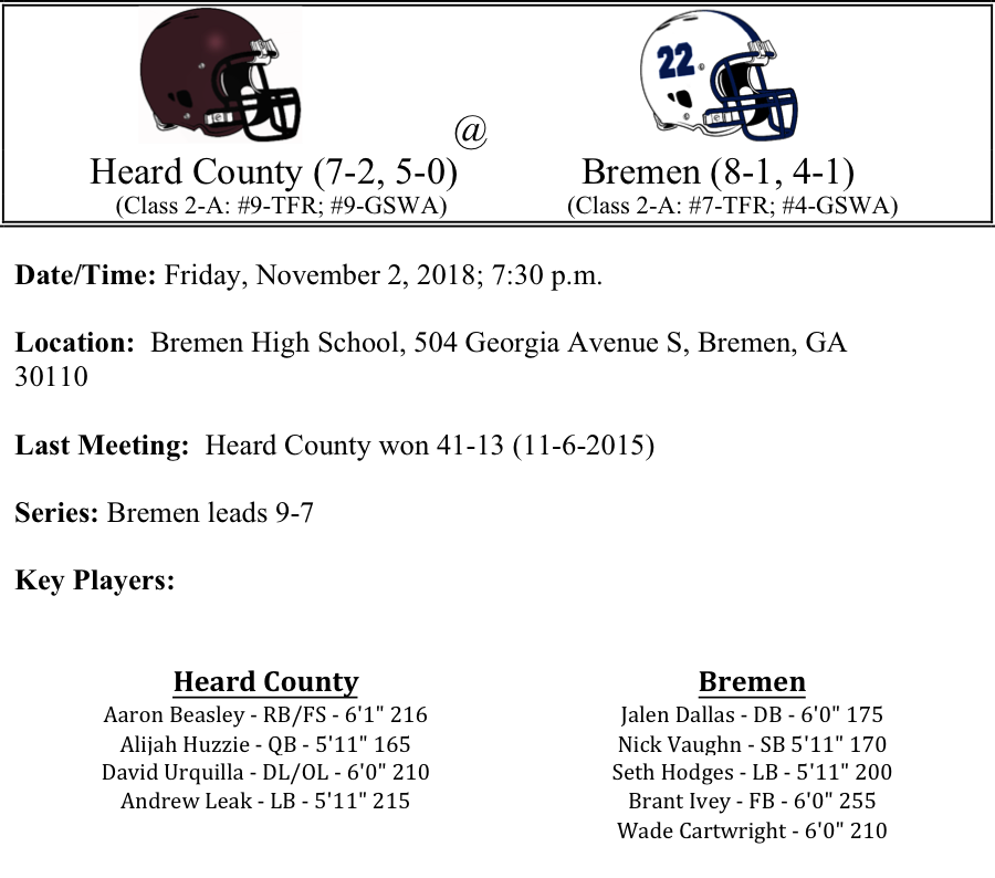 The Heard County Braves will travel to Bremen with a chance to clinch their 5th region title in 7 years. Since a 33-point set back to Rockmart, the Braves have beaten all-comers including a three-point win over Callaway. Heard County is averaging 33.5 points per game in their seven wins. In their two losses, they’ve combined for 3 points total. While Aaron Beasley isn’t the sole reason for Heard County’s success, he is a big reason. The two-way star makes big plays from his safety position on defense and can break a long run in an instant.