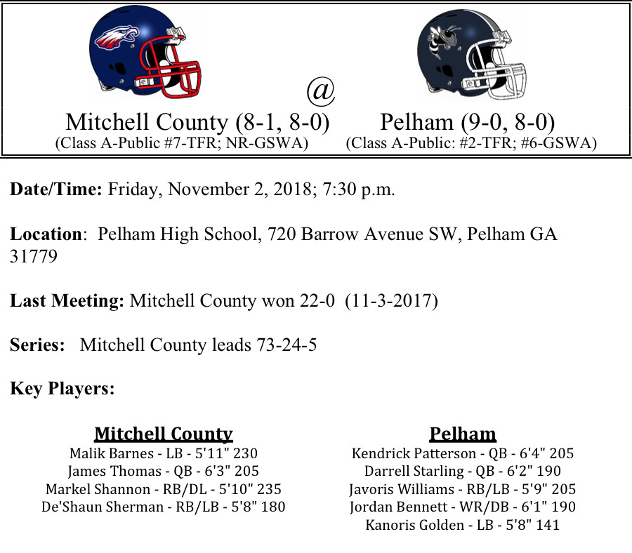 Week-12 ushers in the end of the regular season for GHSA football. In part two of our Eight Greats Around The State, we look at two games which will determine the region champion, one game that could determine the title or muddy up the playoff picture and one game that will decide which team will host a first round playoff game and which team will be on the road. Heard County hosts Bremen on Friday night with a lot at stake. A Heard County win will secure a region title for the Braves, while a Bremen win will force a tie breaker to determine the region winer…Mitchell County and Pelham will tangle for the 103rd time this weekend. Mitchell County has dominated the series, but Pelham has been soaring this season. A lot at stake in this one including a region title, county bragging rights, and improved standing in the power ranking…The winner of the Stockbridge-Jones County game will not region title, but the winner will host a home playoff game…Meanwhile, Wayne County and Ware County will battle for a region title in Jessup. Will MJ Fuller run wild or will the youth movement of the Ware County Gators prevail…