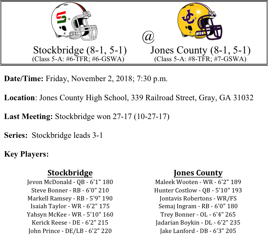 While a region title is not on the line on Friday night, a home playoff game is the reward for the winner of the Stockbridge-Jones County game. The teams play a contrasting style as Stockbridge has been more geared towards the run, while Jones County likes to air it out. Stockbridge quarterback Jevon McDonald has passed for 935 yards on the season. But McDonald also leads the team in rushing with 735 yards and 11-TDs. The Stockbridge defense is giving up 11 points per game this season. John Prince has recorded 7 sacks and leads Stockbridge.