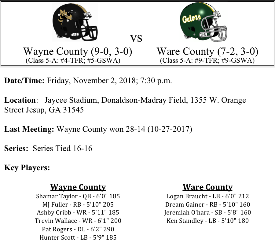 Ware County is looking to get back on top of the region this Friday. They have done it primarily with a youth movement on offense at the skill positions. Freshman QB Thomas Castellanos leads the team in passing (867 yards, 7-TDs) and rushing (575 yards, 11-TDs), while sophomore Dream Gainer is second on the team in rushing with 459 yards on the ground. Jeremiah O’hara leads the Gators in receptions (34) and receiving yards (337). Senior Logan Braucht leads the Gators defense with 91 total tackles. Braucht also leads the team in sacks with 4. Wayne County is playing this game at home, we think that’s worth at least a field goal. We like the Jackets to edge the Gators this week and claim their second consecutive region crown.