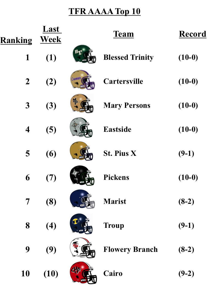 In Class 4A the Cartersville defense flexed it’s muscle to win the Region 5-4A title. There were no new entrants into the poll, but Troup drops to No. 8 this week.