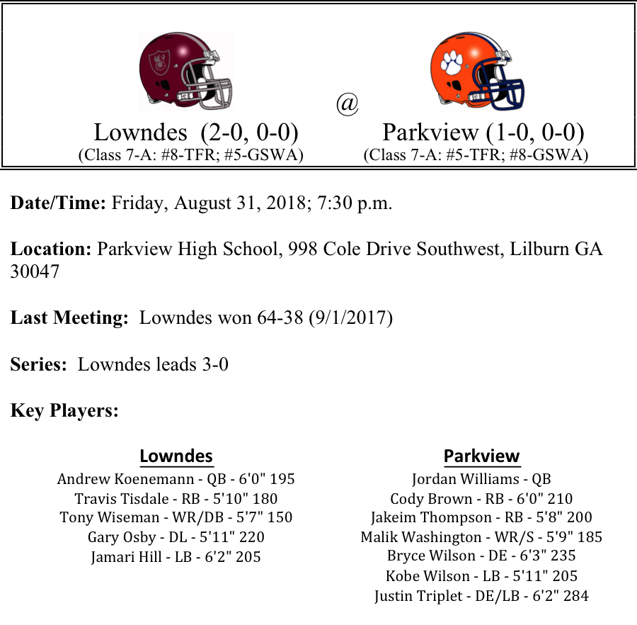 The Lowndes Vikings will visit the Parkview Panthers in an early season 7A top-10 matchup. Both teams have been relatively untested early on in the season, but all of that will change on Friday in the Big Orange Jungle. Lowndes is led on offense by quarterback Andrew Koenemann, running back Travis Tisdale and receiver Tony Wiseman. The Vikings have been able to run and pass the ball effectively. So the Panthers will have their work cut out for them.