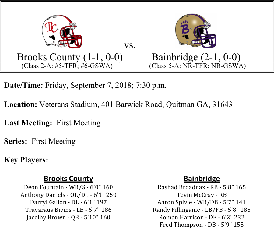 Bainbridge will be looking to get back on track this week after losing on the road to Tallahasee Lincoln last week. The Bearcats also feature an impressive ground game headed by Rashad Broadnax. The sophomore has rushed for 285 yards and 2-TDs on the young season. Tevin McCray has chipped in 111 yards on the ground this season and has a touchdown as well. We think that Roman Harrison and the Bainbridge defense will give Brooks just enough trouble to pull of the win this week on the road. Bainbridge by a touchdown.