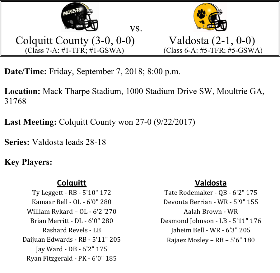 Perennial South Georgia powers Colquitt County and Valdosta will meet up on Friday at Mack Tharpe Stadium for the 46thtime. The host Packers have been slicing through their competition like a hot knife through butter. They have outscored their opponents 133-24. Daijuan Edwards continues to pace the Pack on the ground as he has racked up 433 yards and 6-TDs on the season. Quarterback Jaycee Harden seems to be settling in nicely for Colquitt County. He’s competing 67% of his passes and is averaging just over 150 yards passing per game this season.