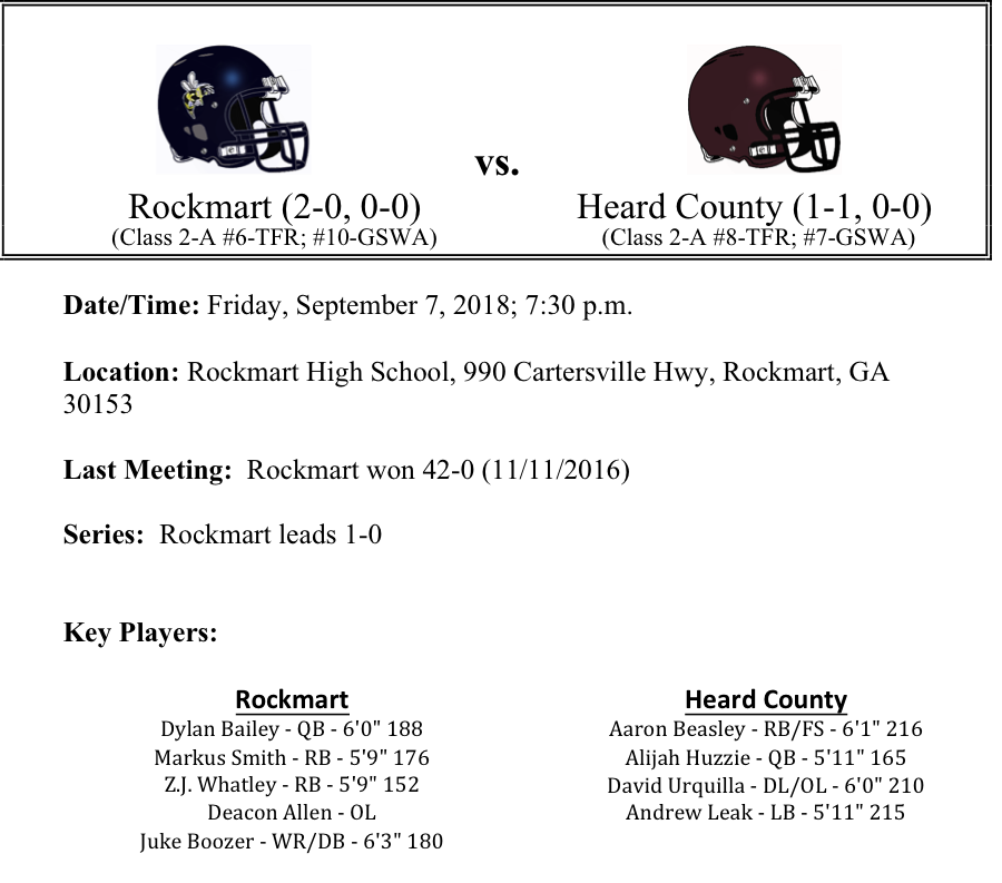 Heard County will visit Rockmart as they face their second top-10 AA team in as many weeks. The Heard County Braves were beat by the Hapeville Hornets last week after keeping the game close during the first half. This week, the Braves will have to compete with the running back combination of ZJ Whatley and Javin Whatley. The two backs have combined for 205 yards and 4-TDs through Rockmart’s first two games. Juke Boozer is a big play threat for the Yellow Jackets offense. He is averaging 32.3 yards per reception.