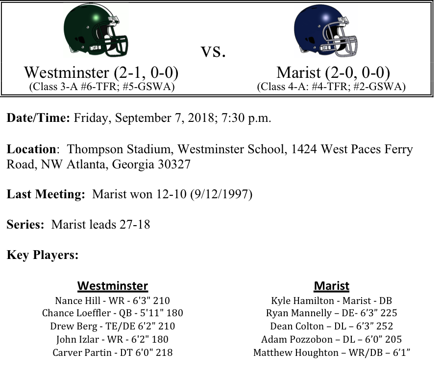 Westminster and Marist have played 45 times in a rivalry dating back to 1957, but this will be the first meeting since 1997. The Westminster Wildcats fast start was derailed last week by a stingy St. Pius X Lions team. This week, they will try to get back on track as the host the Marist War Eagles. The Wildcats will need to find a way to get one of their quarterbacks going whether it by Chance Loeffler or Parks Harber. Last week, Harber led the way with 171 yards through the air.