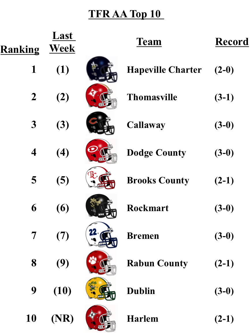 In 2-A, the top 7 spots remain unchanged. Heard County drops out of the poll after a loss to Rockmart. While the Harlem Bulldogs make their first entry into the poll at No. 10.