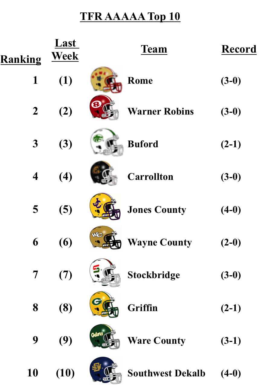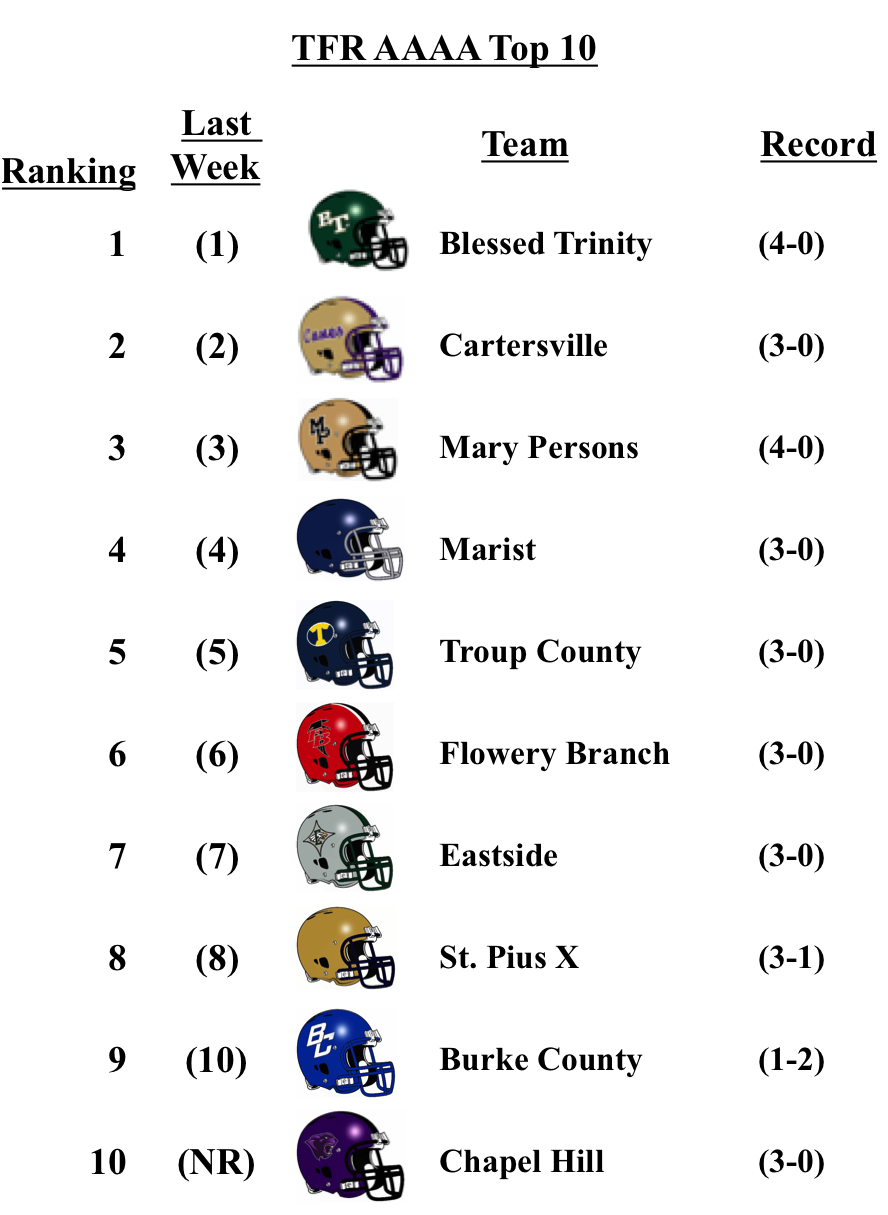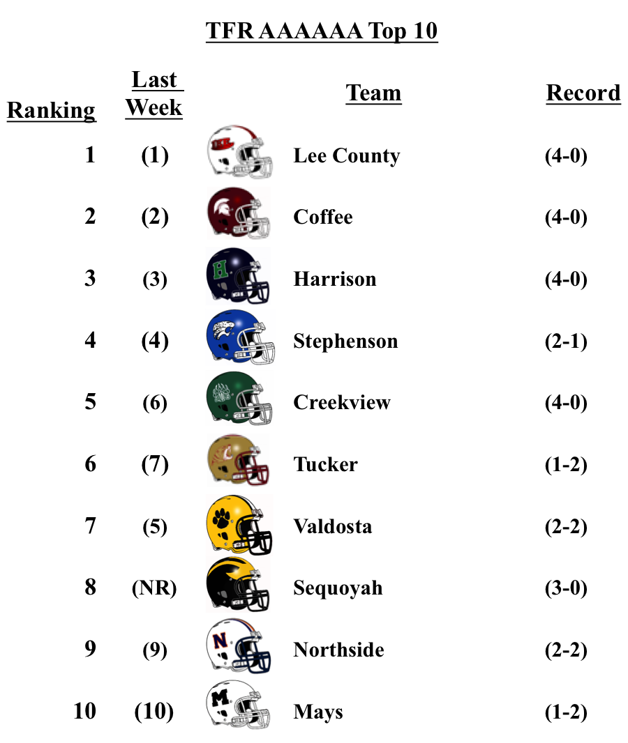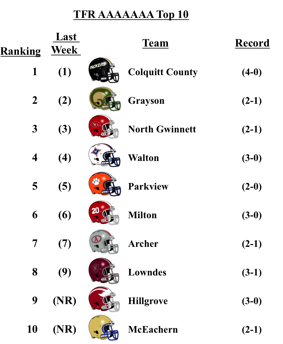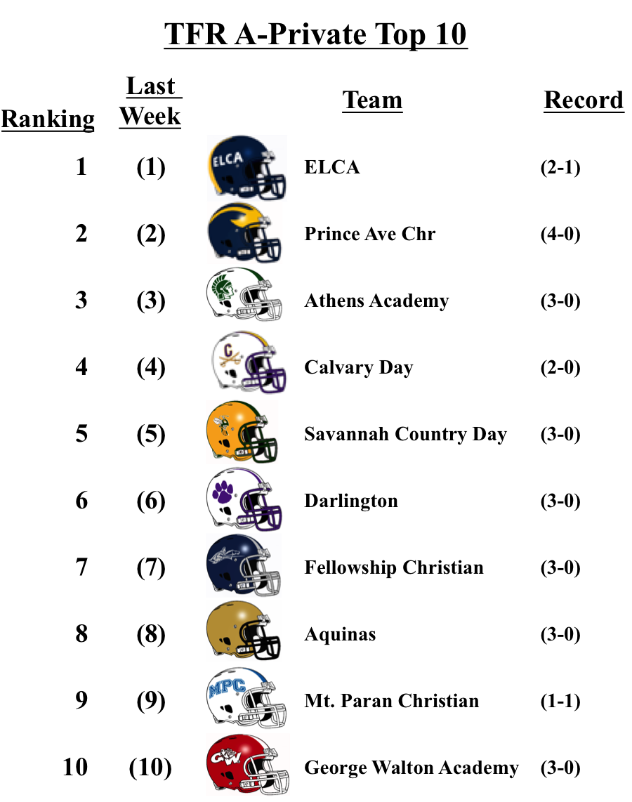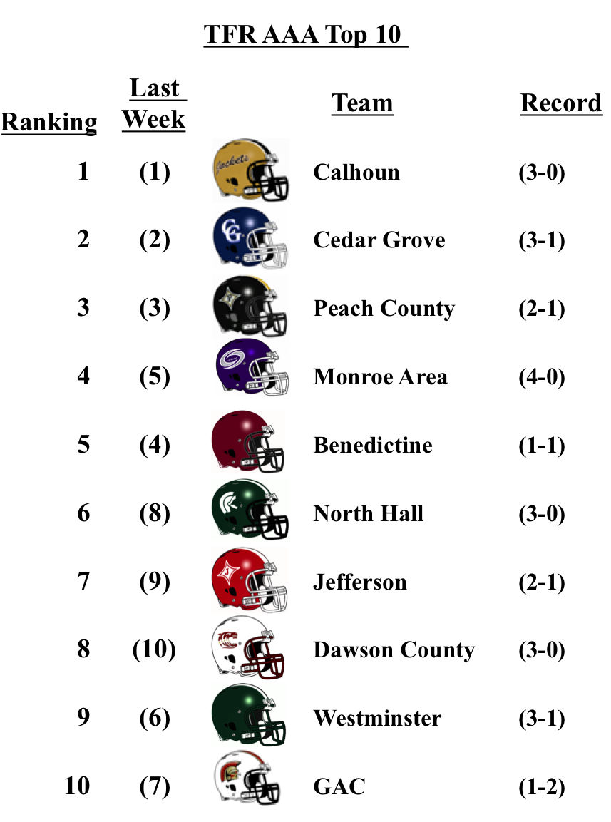 There was a bit of movement within 3-A, but no new entrants. Cedar Grove lost to 7-A McEachern by a touchdown, but still remains at No. 2. Benedictine drops one spot after falling to 4-A No. 1 Blessed Trinity. Westminster and GAC drop to No. 9 and 10 respectively after losses this week.