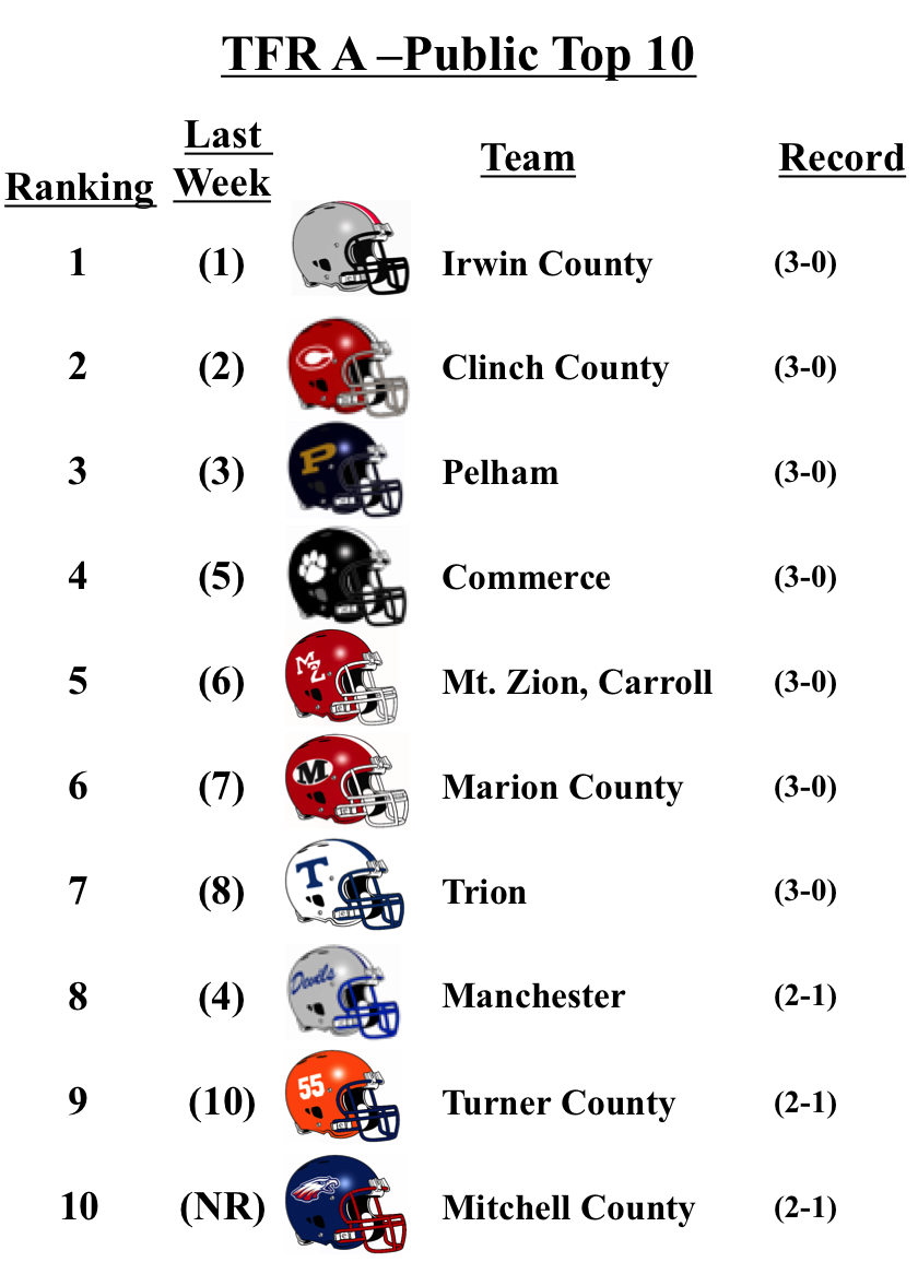 In 1-A Public, Mitchell County is back into the top 10 this week after the beat Miller County soundly on Friday night. Manchester drops 4 spots after losing to Northeast, Macon.