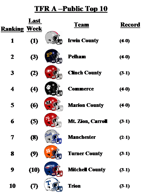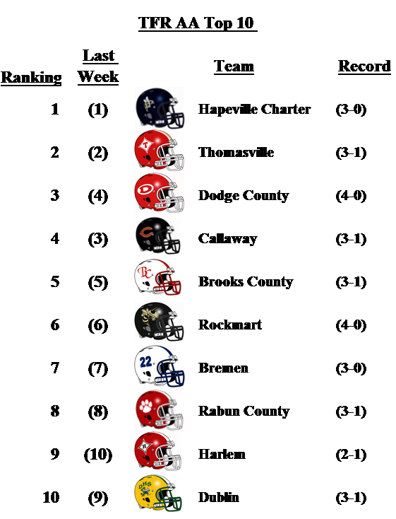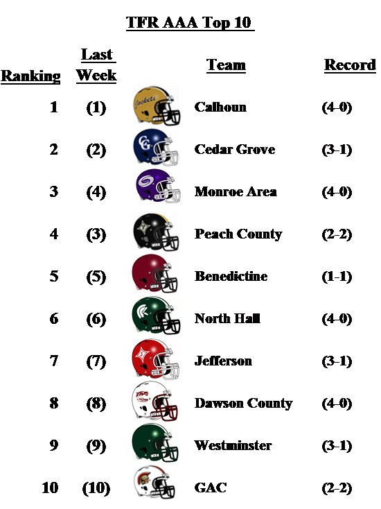 In 2-A, Callaway falls one spot after losing to 4-A Troup County. Brooks County beat Dublin. The loss drops the Fighting Irish to No. 10 this week. The Harlem Bulldogs move up one spot to No. 9 after defeating Laney on Saturday.