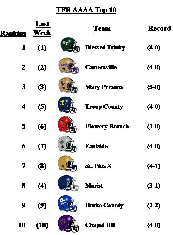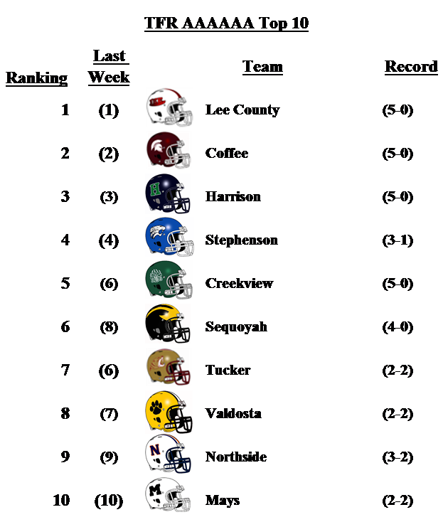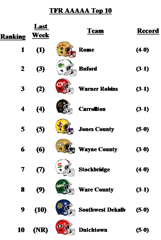 In 5-A Dutchtown comes in at No. 10 and makes their first appearance in the poll this season. Rome outlasted Carrollton in a wild contest on Friday night. Buford moves back up to No. 2 with a win over Newton coupled with a Warner Robins loss to Colquitt County.