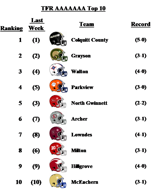 There was a little shuffling of positions in the 7-A poll this week. Colquitt County remains a top the poll. Walton and Parkview both move up one spot, Walton had a big win against North Gwinnett while Parkview beat Tift County. Perhaps the biggest surprise was Roswell downing rival Milton. Milton still sits at No. 8 in this week’s poll.