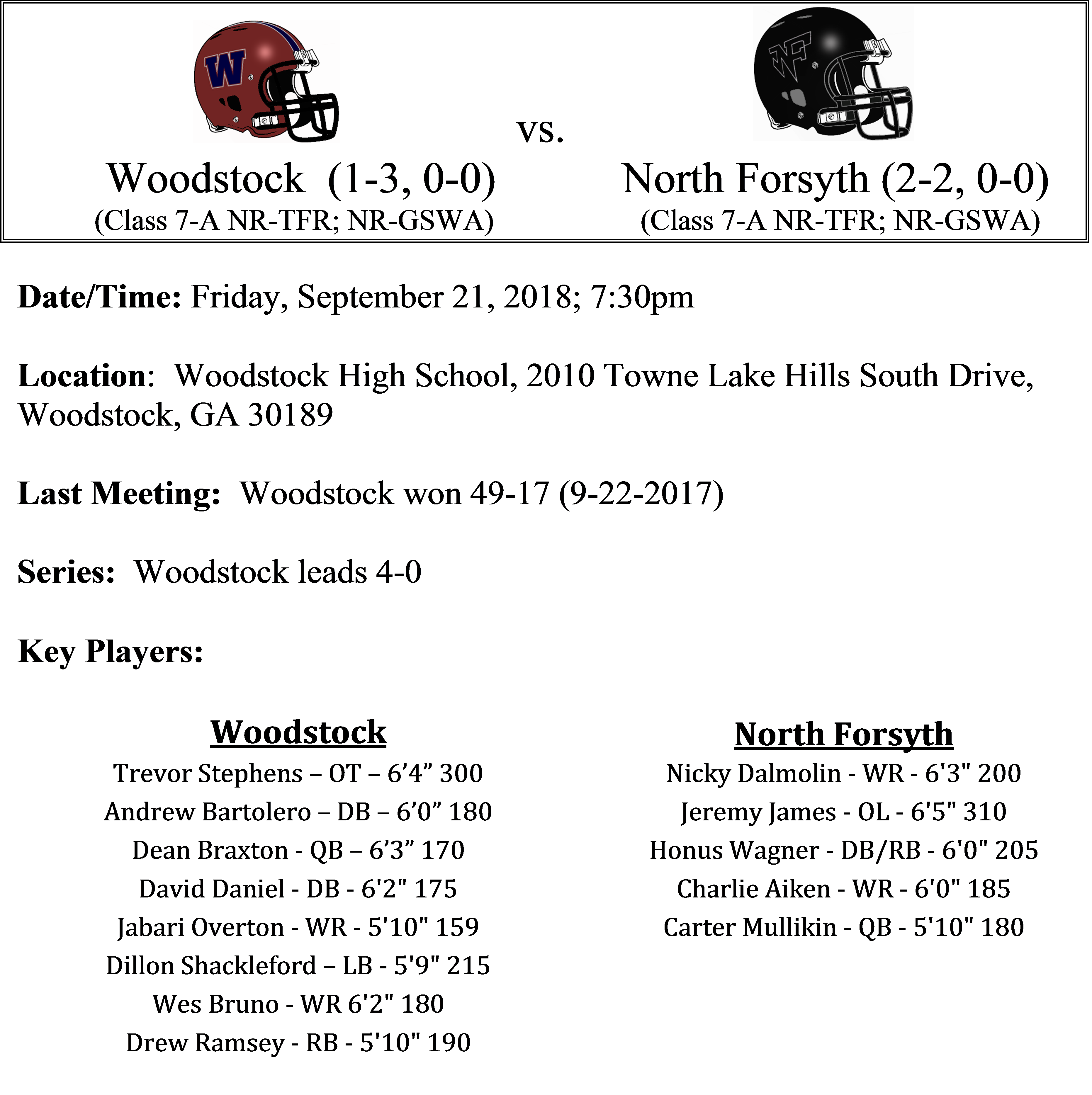 The Woodstock Wolverines will look to get back on track this Friday as they host the North Forsyth Raiders. The Raiders lost a shoot-out last week to Kennesaw Mountain. Honus Wagner has filled in nicely for the injured Bryson Trigg this season. Wagner who plays both ways, has rushed for 595 yards and 4-TDs on the season. Dual threat quarterback Carter Mullikin has thrown for 419 yards and rushed for 374 yards, but has also tossed 6 interceptions. Junior linebacker Jake Tucker paces the Raiders on defense with a team leading 35 total tackles on the season.